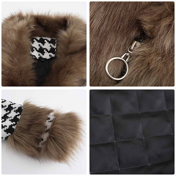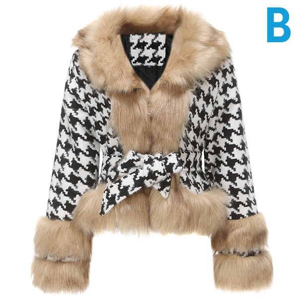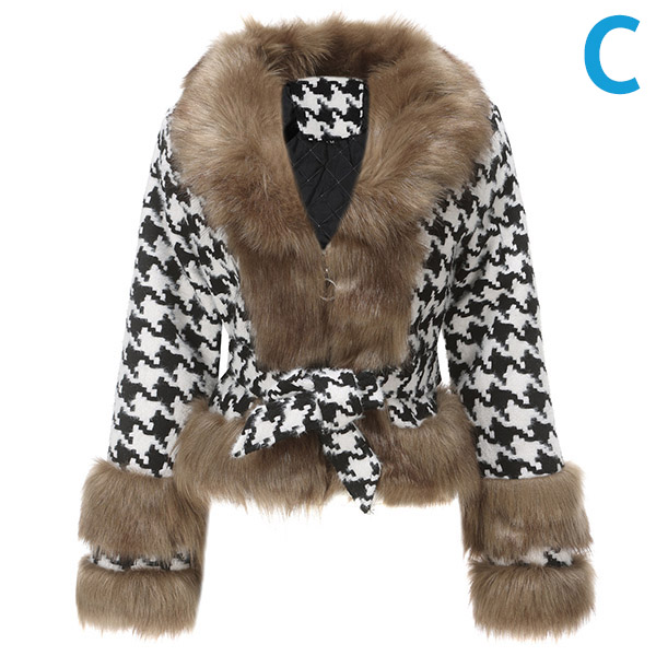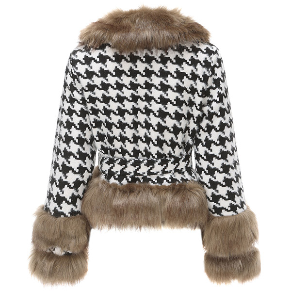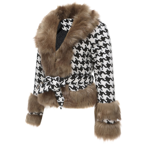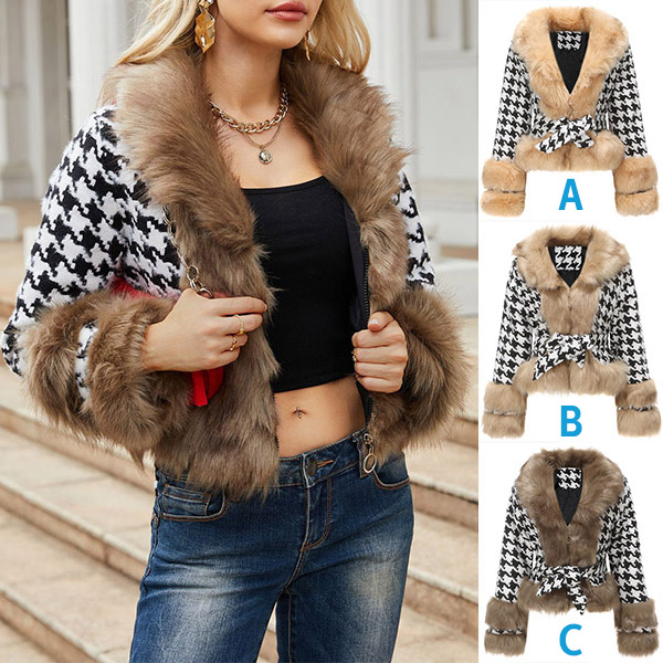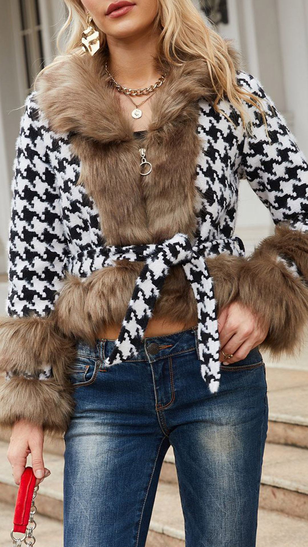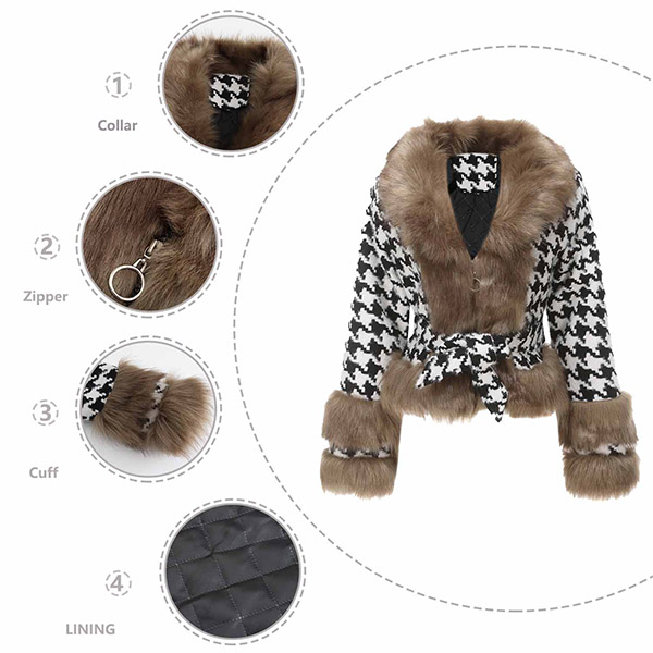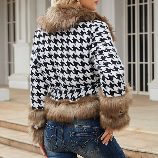 Wow, a chic jacket! The houndstooth pattern adds a touch of classic sophistication, while the artificial fur splicing brings a luxurious and textured element to the jacket. Made from high-quality materials, it ensures both style and comfort.