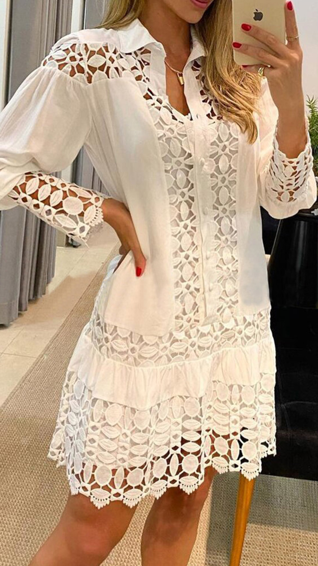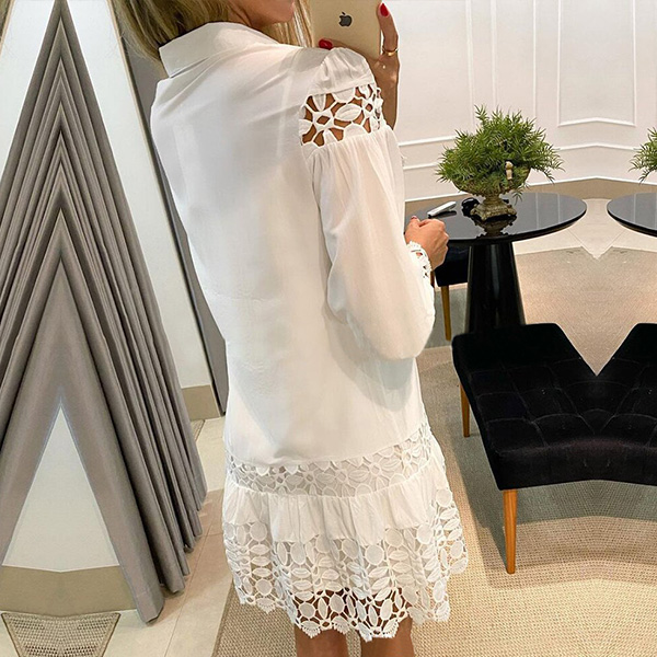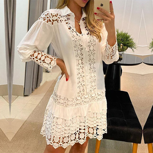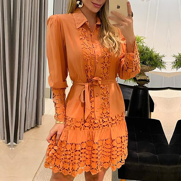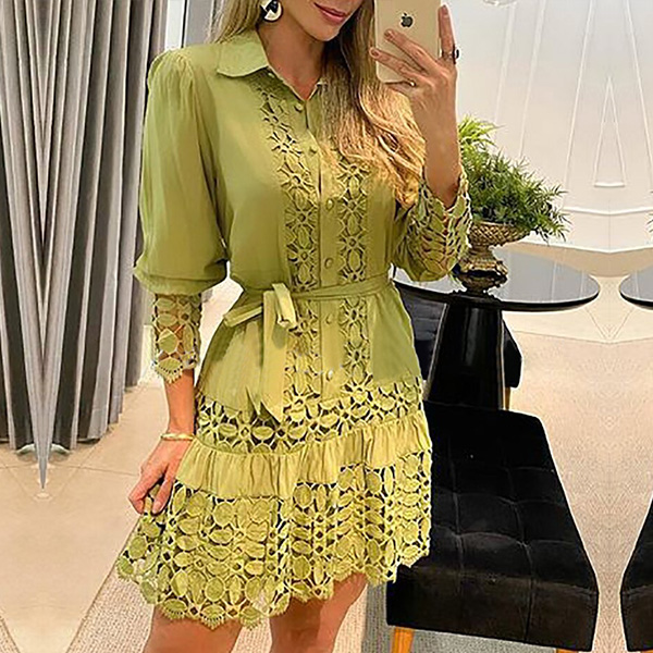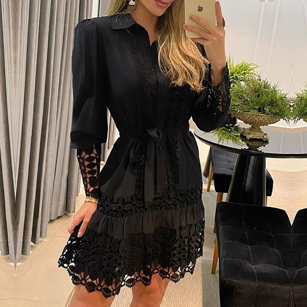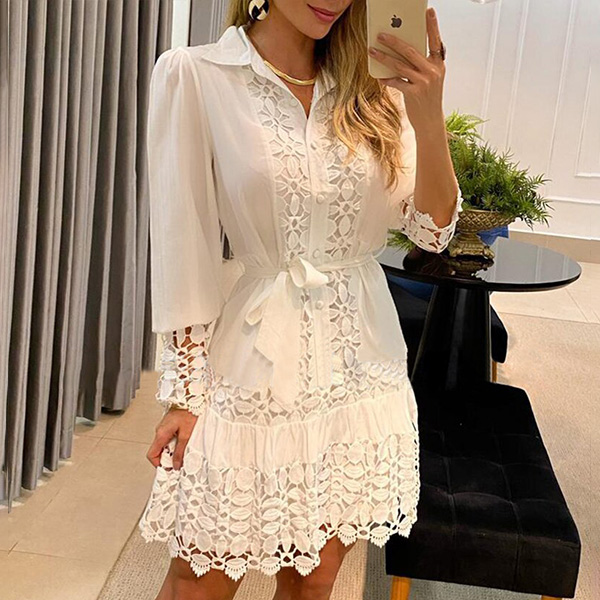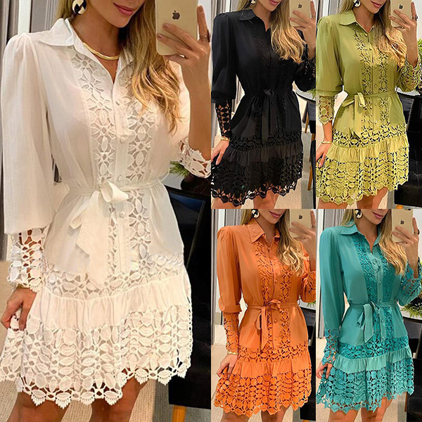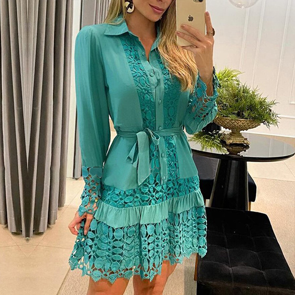 This dress features a unique lace spliced design that adds a touch of femininity and elegance. The self-tie waist belt adds a trendy and fashion-forward element to the dress. Multi-color avaible.