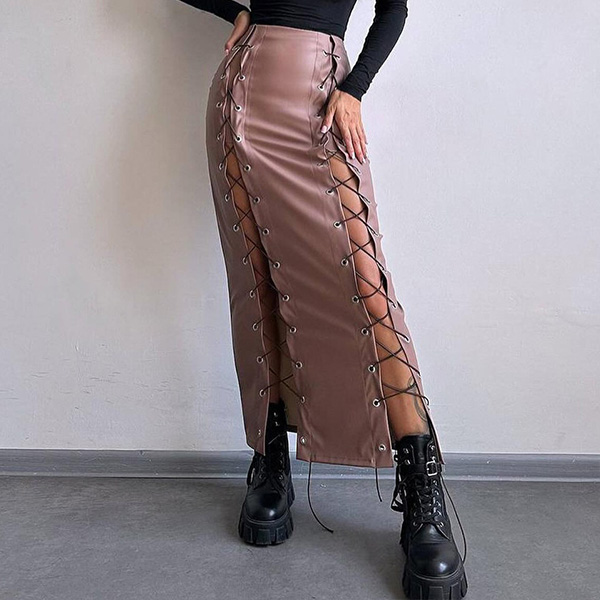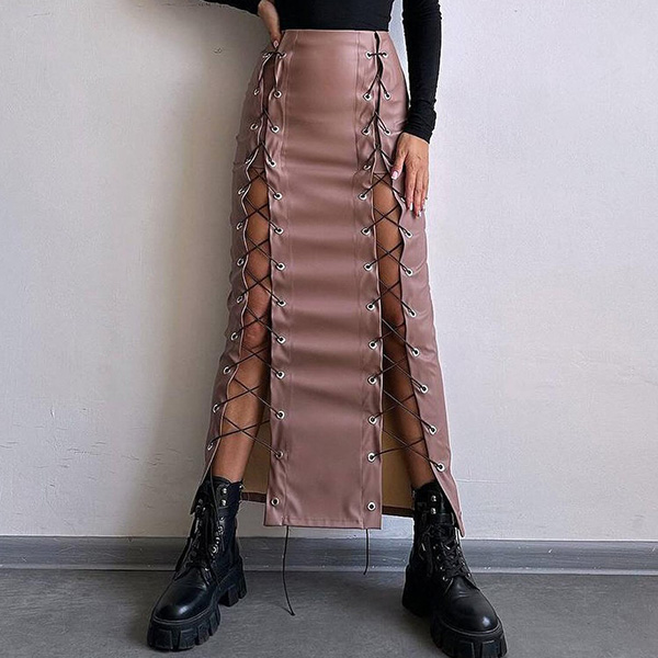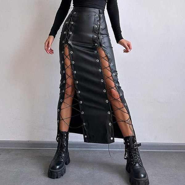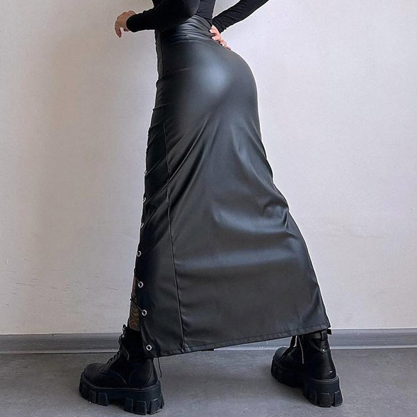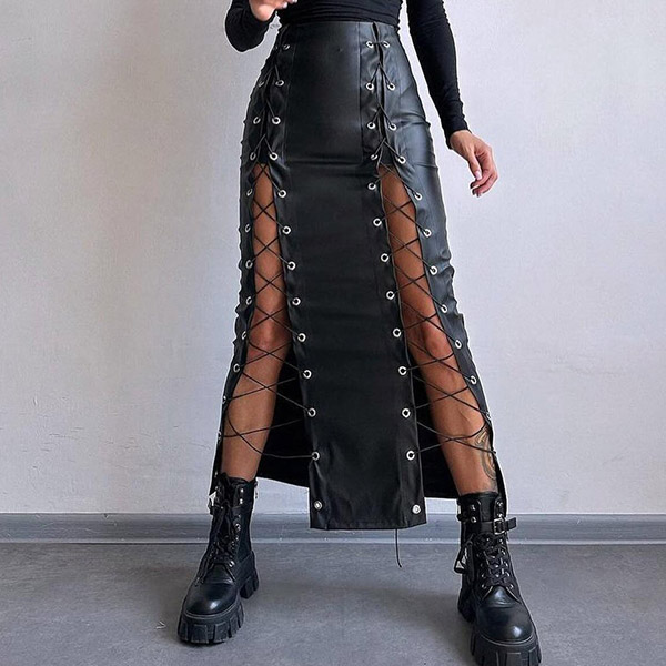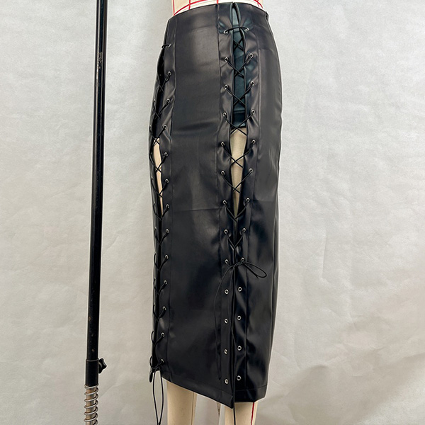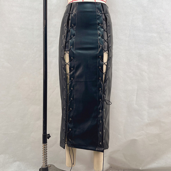 This edgy skirt features striking lace-up detailing with structured artificial leather construction for contemporary urban street sophistication. Pair with fitted tops and combat boots for authentic street fashion appeal. Perfect for street fashion occasions, urban styling, or contemporary edgy wear.
