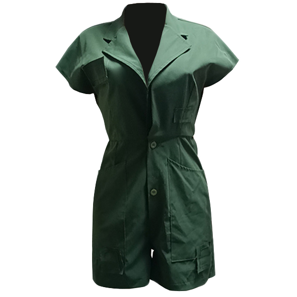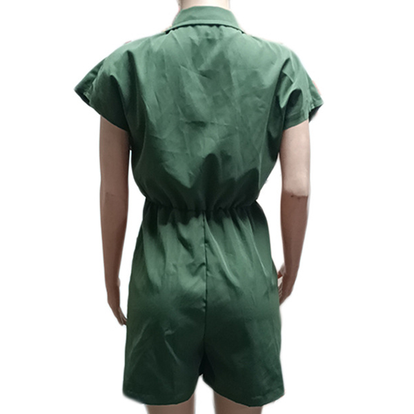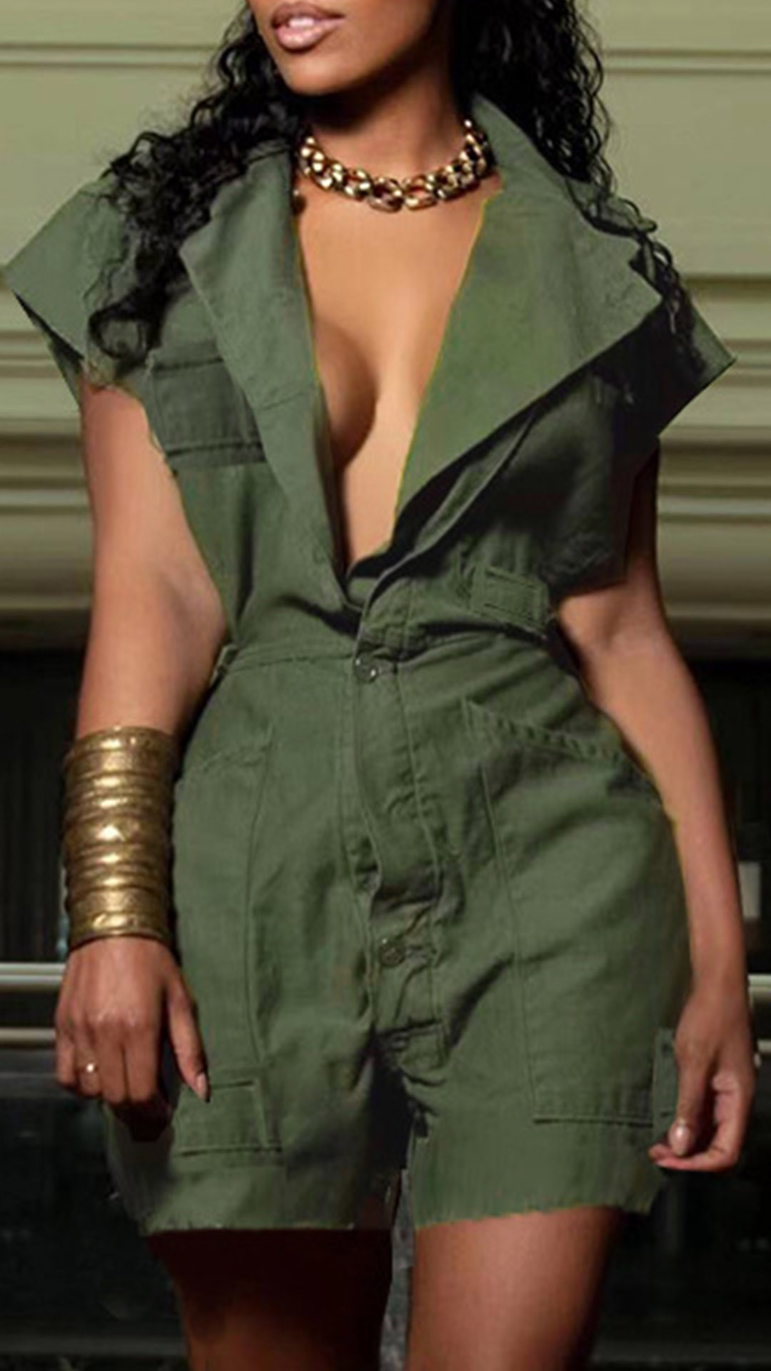 This green romper features a lapel collar, cap sleeves, and patch pockets, combining fashion-forward design with comfort and versatility. You could pair it with sneakers, ankle boots, or platform sandals.
