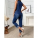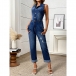 Street Fashion Lapel Collar Front Button Sleeveless Patch Chest Pockets Distressed Old-washed Denim Jumpsuit