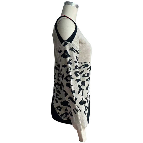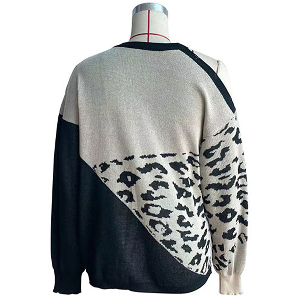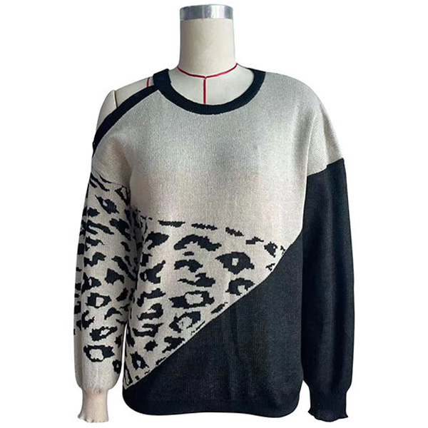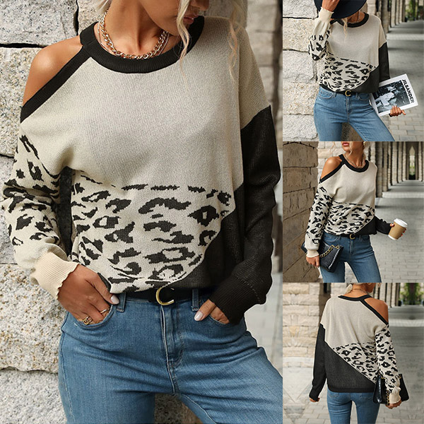 Street Fashion Leopard Print Contrast Color Round Neck Open-shoulder Sweater
