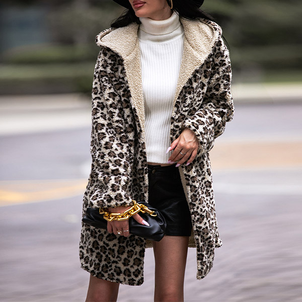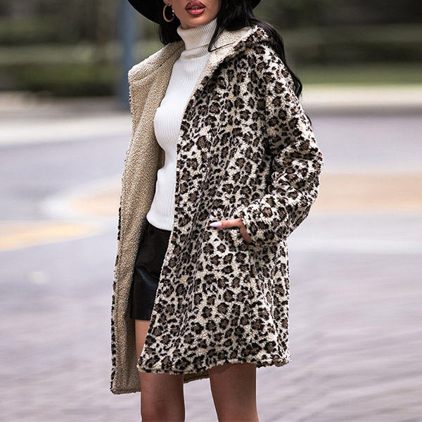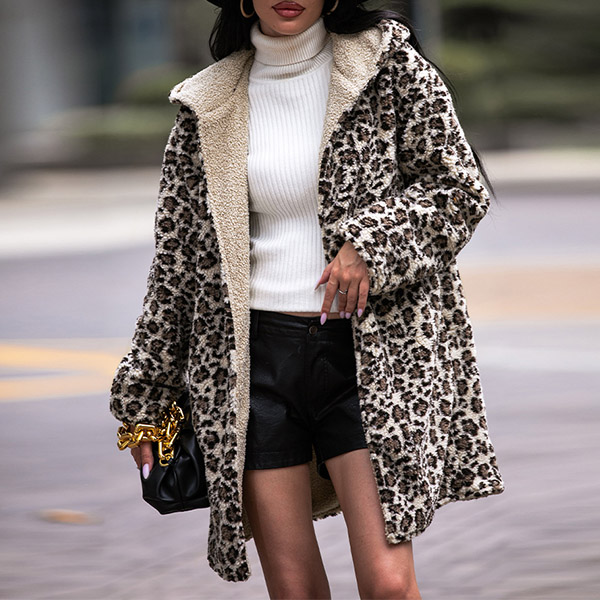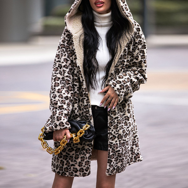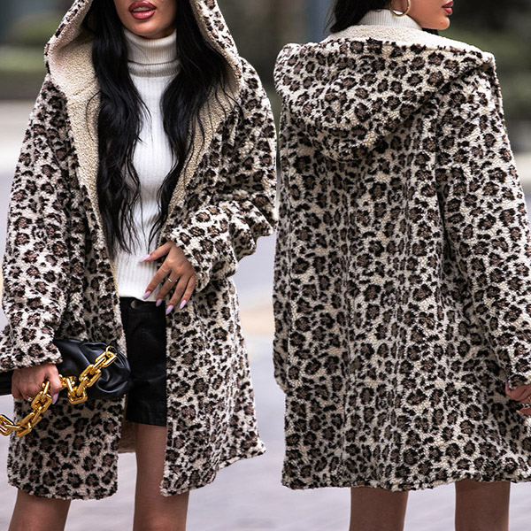Street Fashion Leopard Printed Long Sleeve Hooded Plush Cardigan