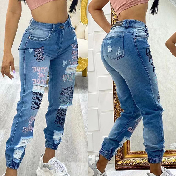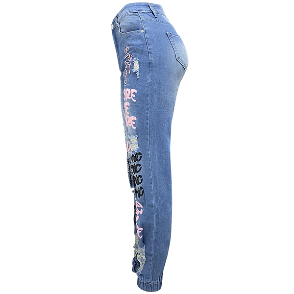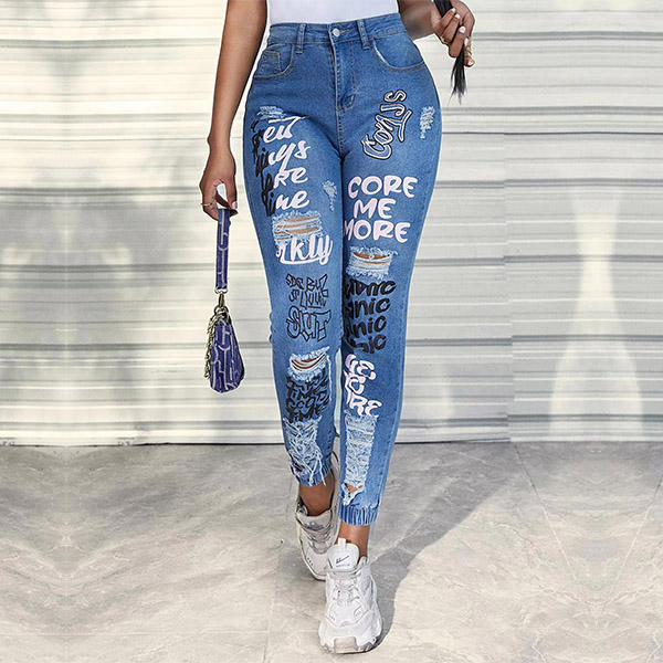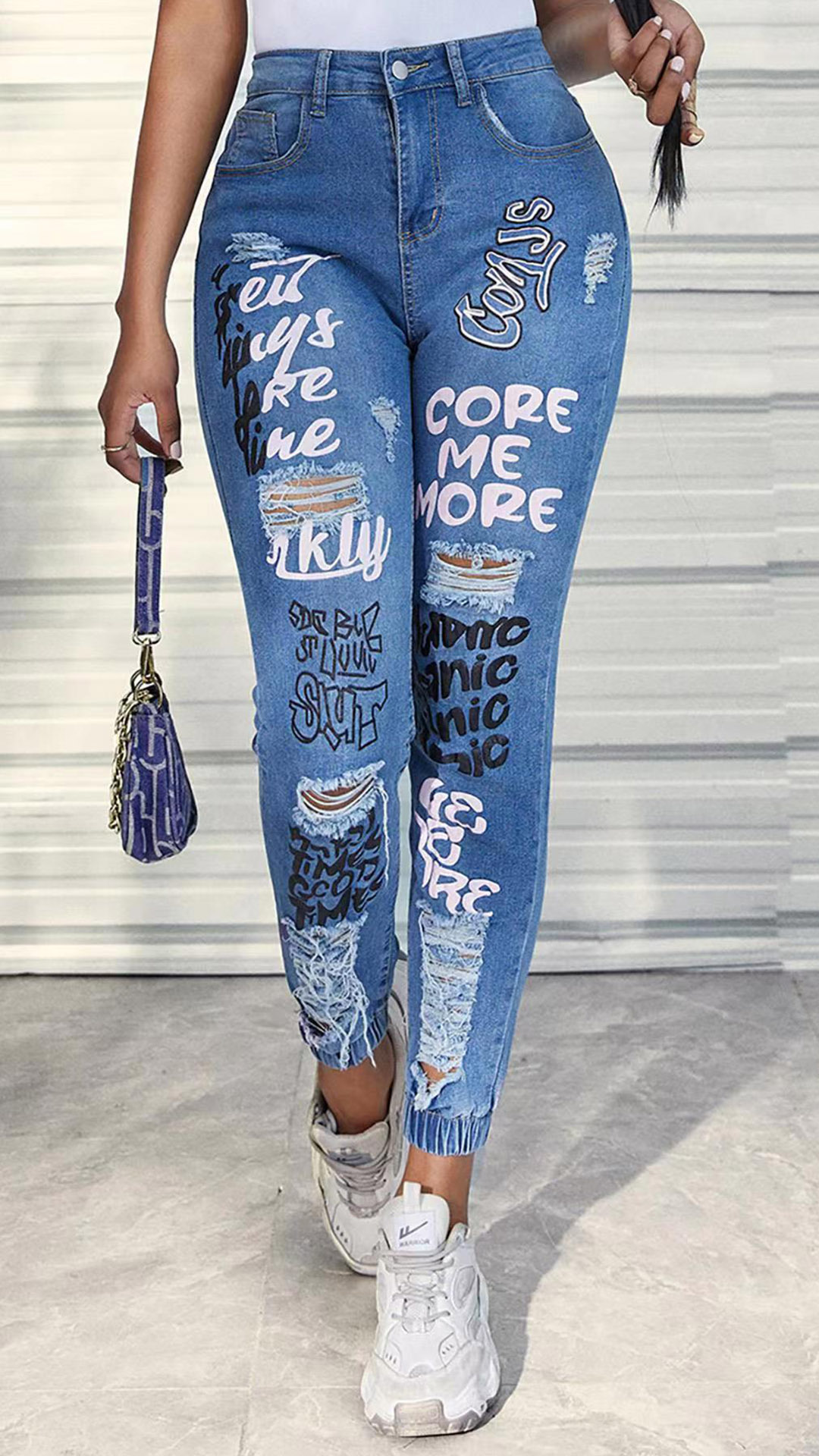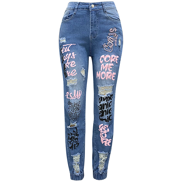 Street Fashion Letter Printed Distreeted Old-washed Denim Jeans