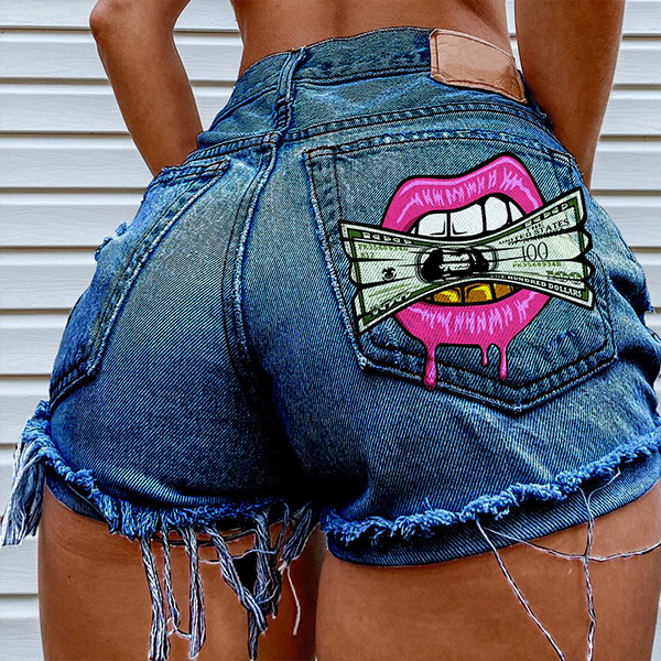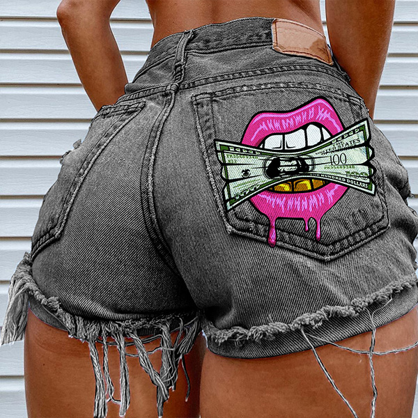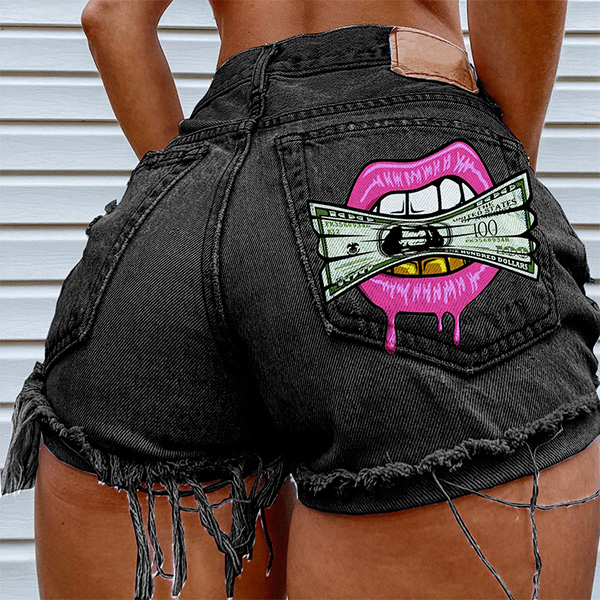 This is a trendy and edgy denim shorts that combines a lip print design with a frayed hemline for a stylish and fashionable look. Pair them with a graphic tee or a crop top for a casual and effortless look.
