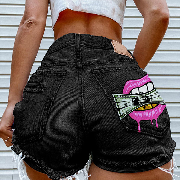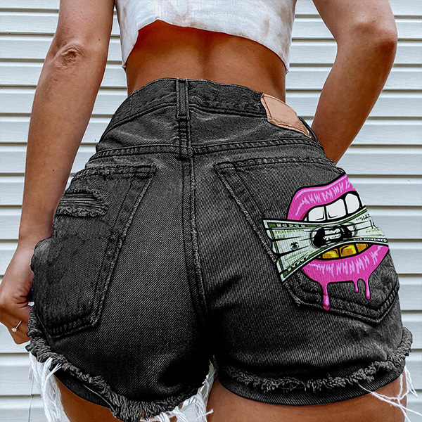 Street Fashion Lip Printed Frayed Hemline Denim Shorts