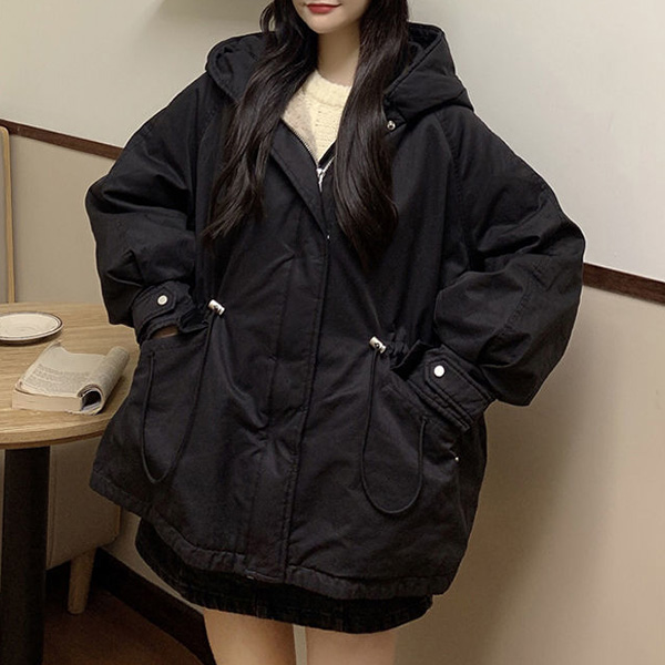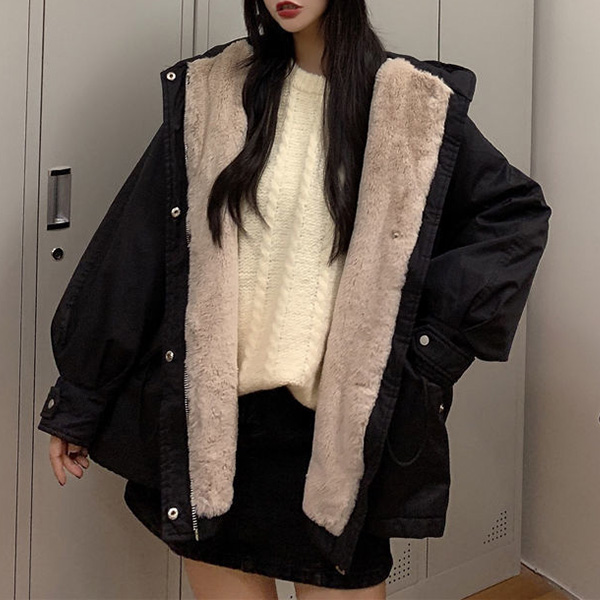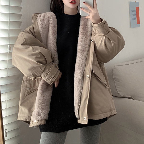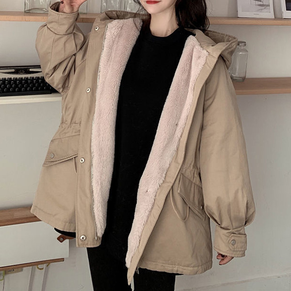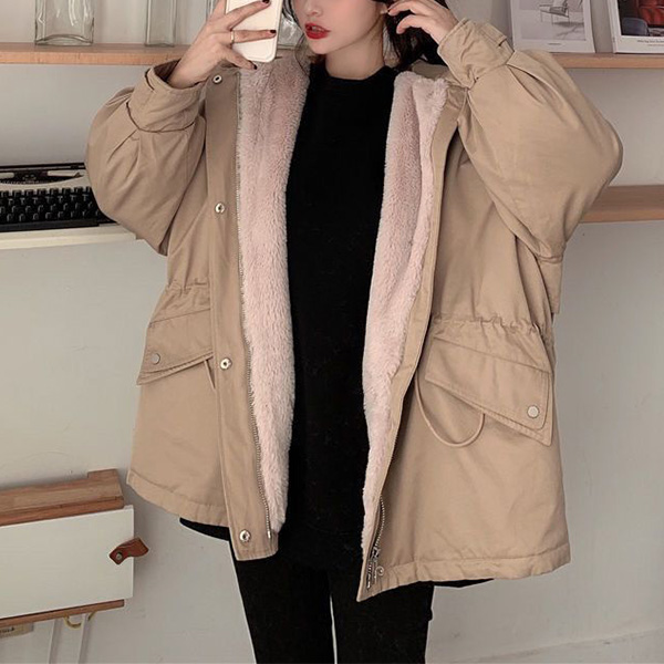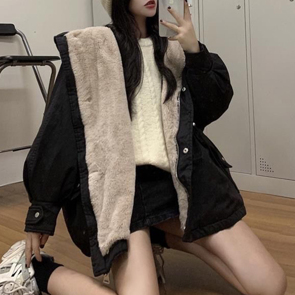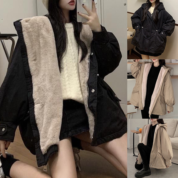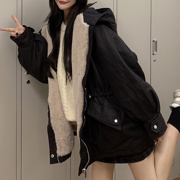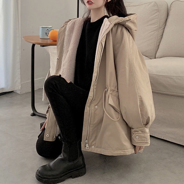 Street Fashion Long Sleeve Hooded Plush Lined Loose Parka Coat for Women