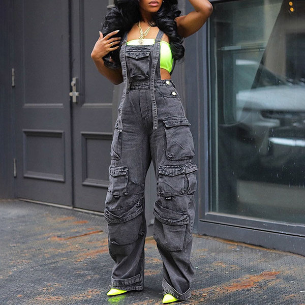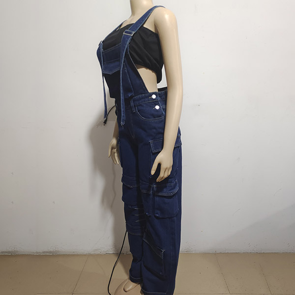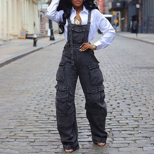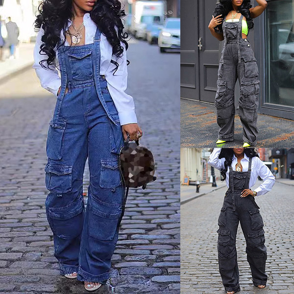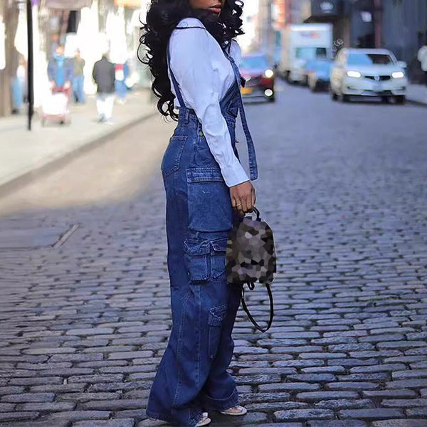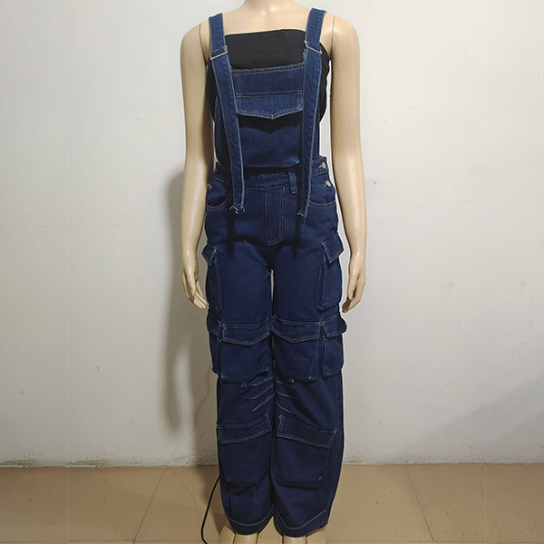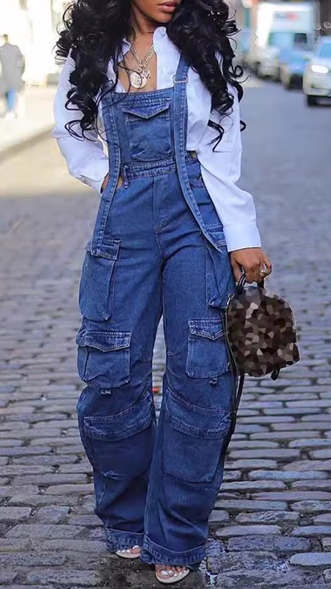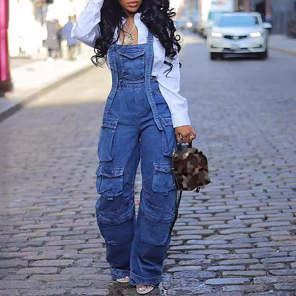 Street Fashion Multi-pockets Loose Suspender Denim Jumpsuit