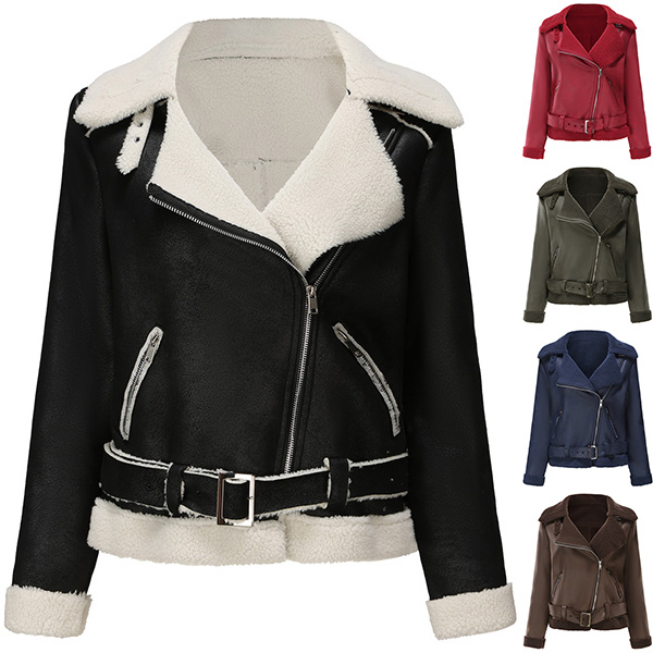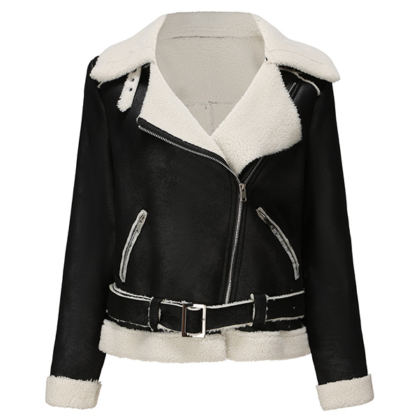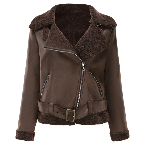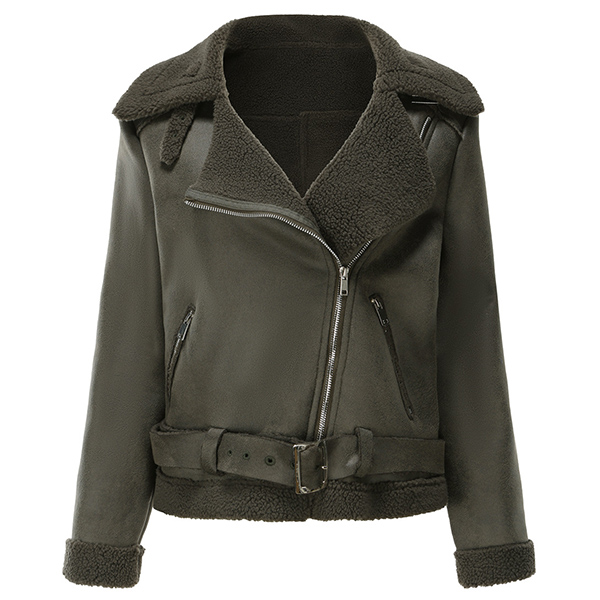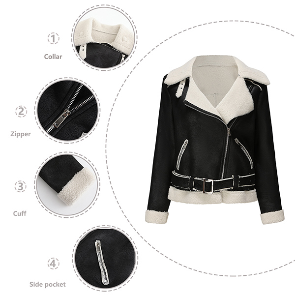 Street Fashion Notch Lapel Long Sleeve Plush Lined Crop Jacket with Belt
