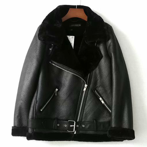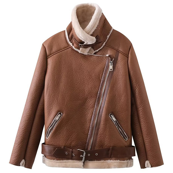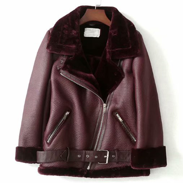 Street Fashion Notch Lapel Slant Zipper Bucklet Plush Lined Artificial Leather PU Jacket for Women