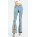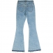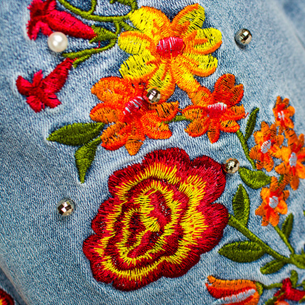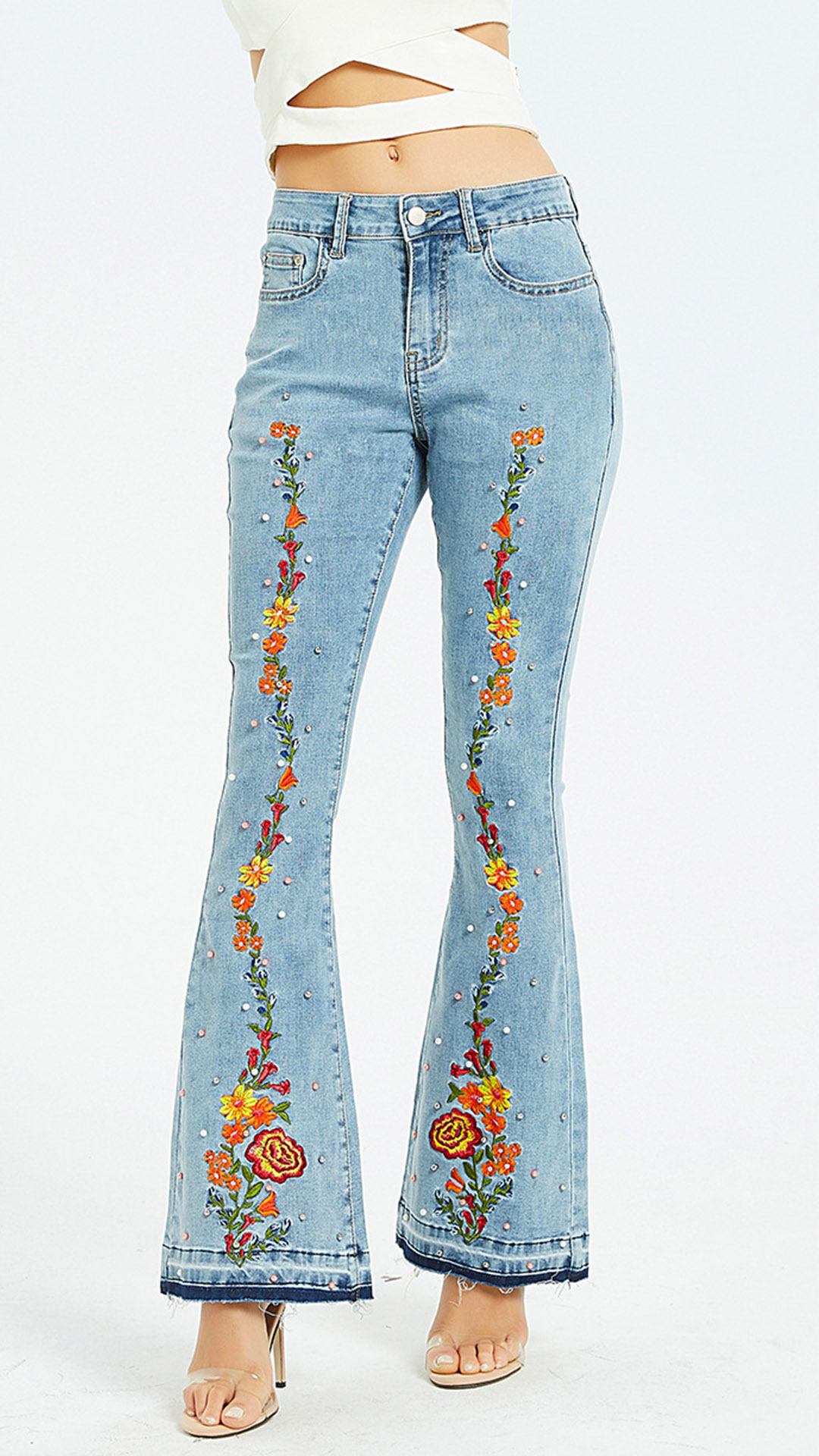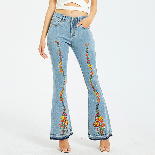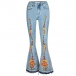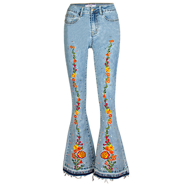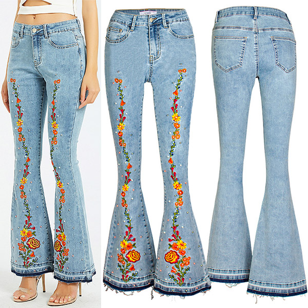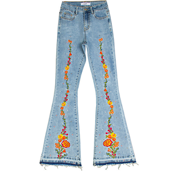 These jeans feature an old-washed finish, floral embroidery detailing, and wide legs with frayed hemlines, adding a touch of femininity, a relaxed and casual aesthetic, making these jeans stand out from the crowd.