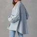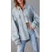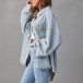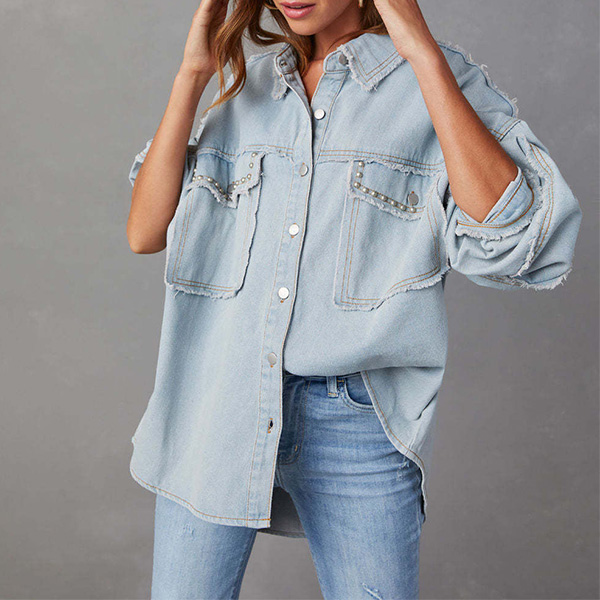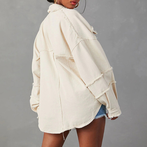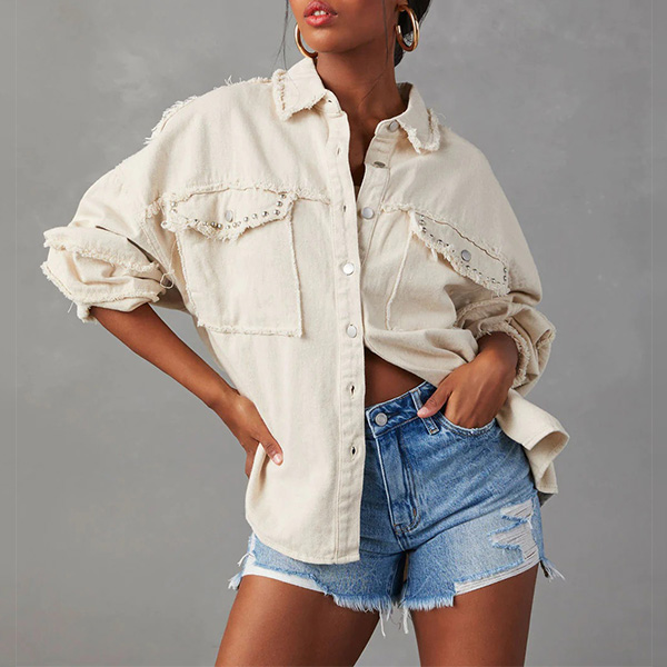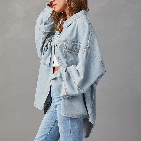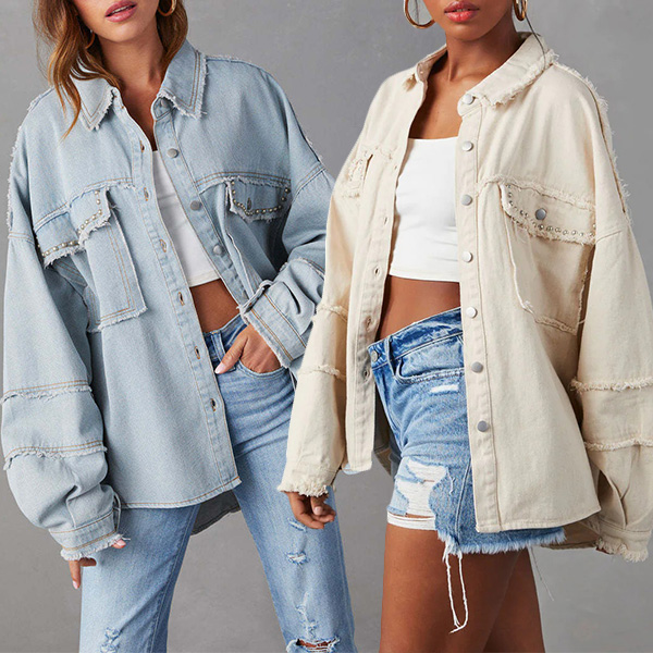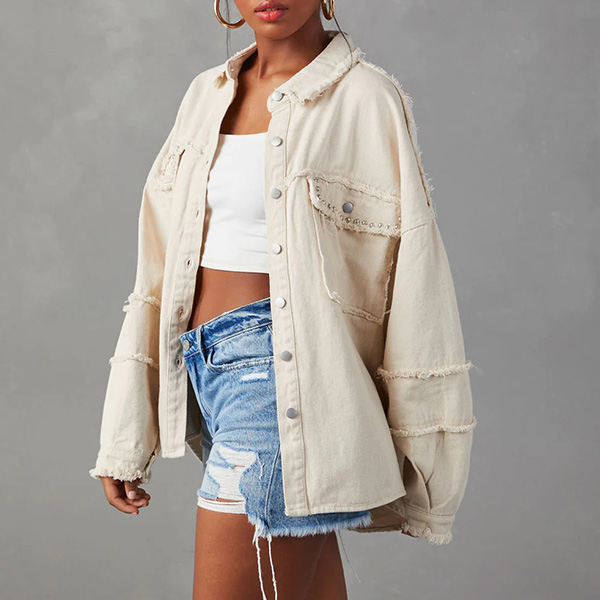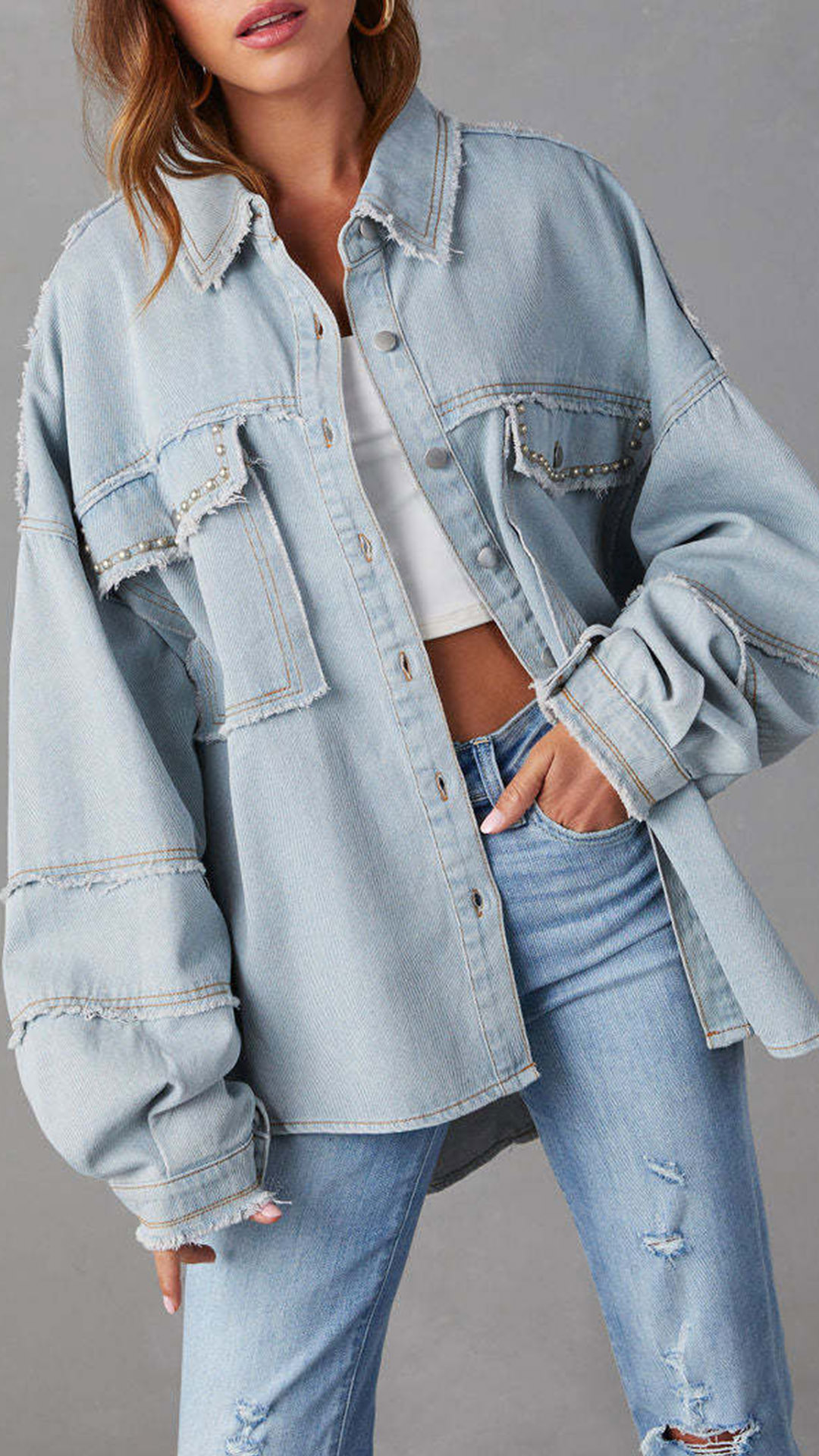 Look at this denim jacket! The old-washed denim gives it a worn-in and distressed appearance, adding character and individuality to your outfit. The frayed details and stand collar add a touch of urban fashion, while the patch pockets and rivets provide a unique and eye-catching element. With its loose fit, it offers both comfort and a relaxed silhouette.