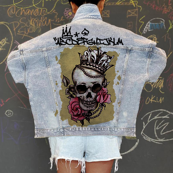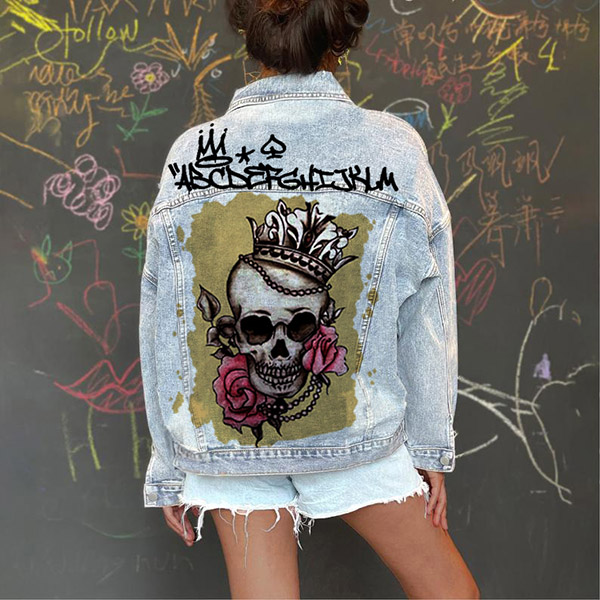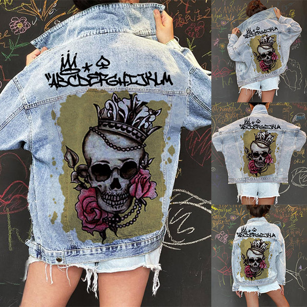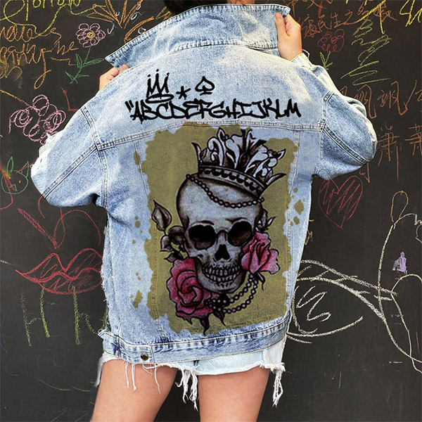 This jacket features an old-washed denim design, giving it a vintage and worn-in look. The skull print adds a rebellious and unique element, perfect for those who want to make a statement. Crafted from high-quality denim fabric, this jacket offers durability and a comfortable feel.