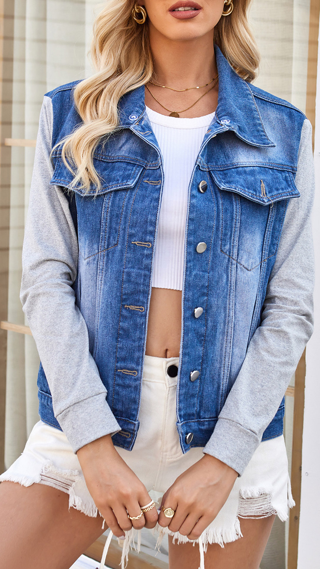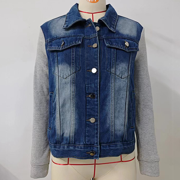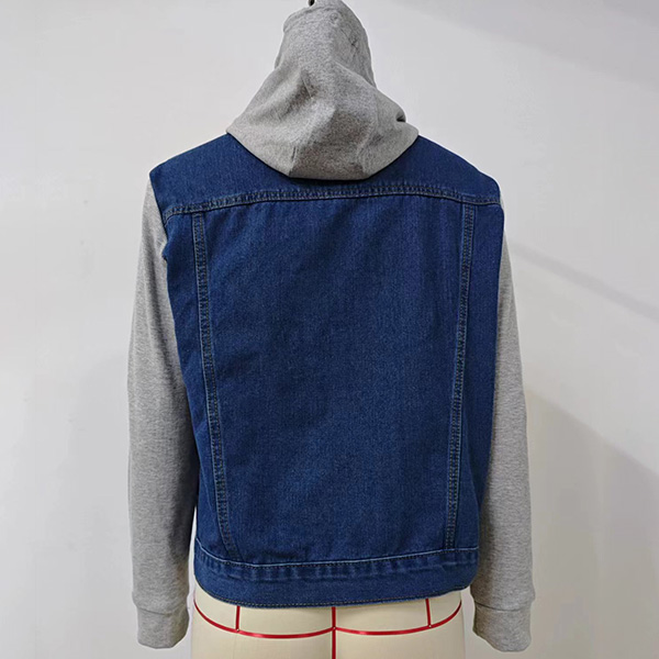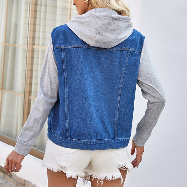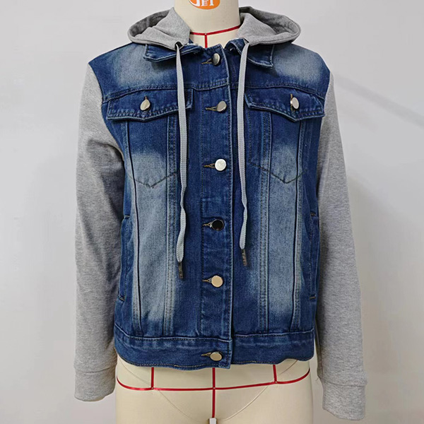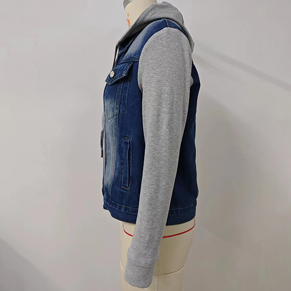 This is a trendy and edgy piece that combines an old-washed denim fabric, spliced detailing, and a hooded design for a fashionable and urban streetwear look.