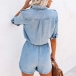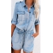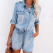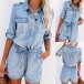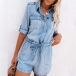Street Fashion Old-washed Stand Collar Buttoned Short Sleeve Drawstring Denim Romper