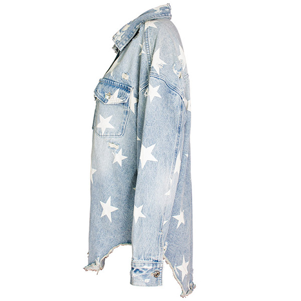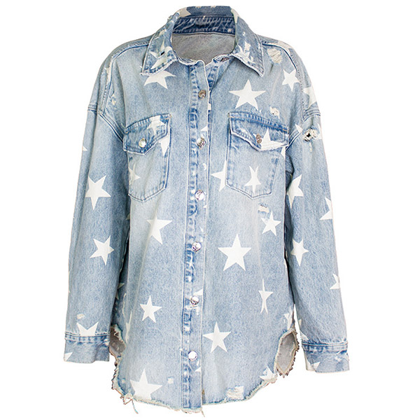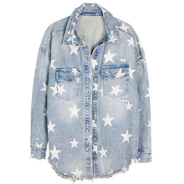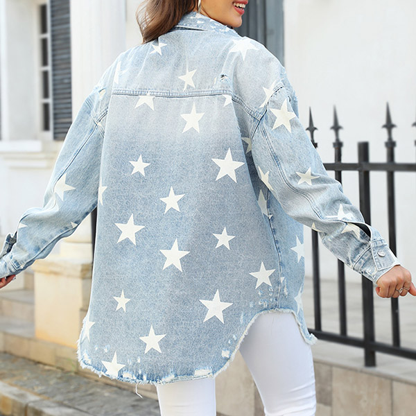 Street Fashion Old-washed Star Printed Frayed Denim Jacket