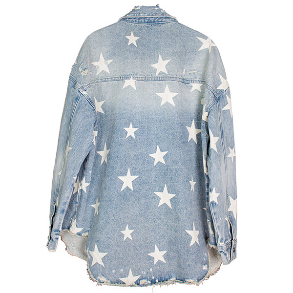 This jacket showcases an old-washed denim fabric, giving it a worn-in and vintage vibe. The star print and frayed hemline add a playful and eye-catching element to the jacket. Wanna have one?