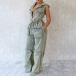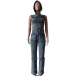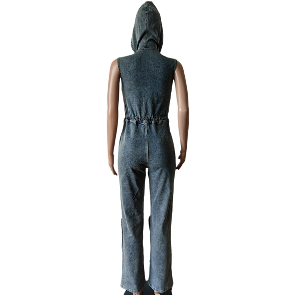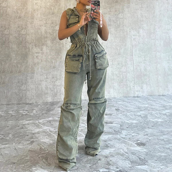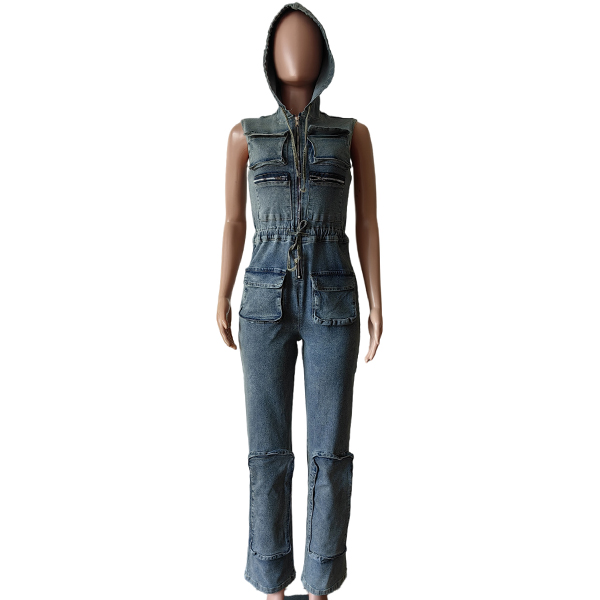 Street Fashion Patch Pockets Sleeveless Elastic Drawstring Waist Old-washed Denim Hooded Jumpsuit