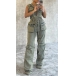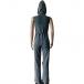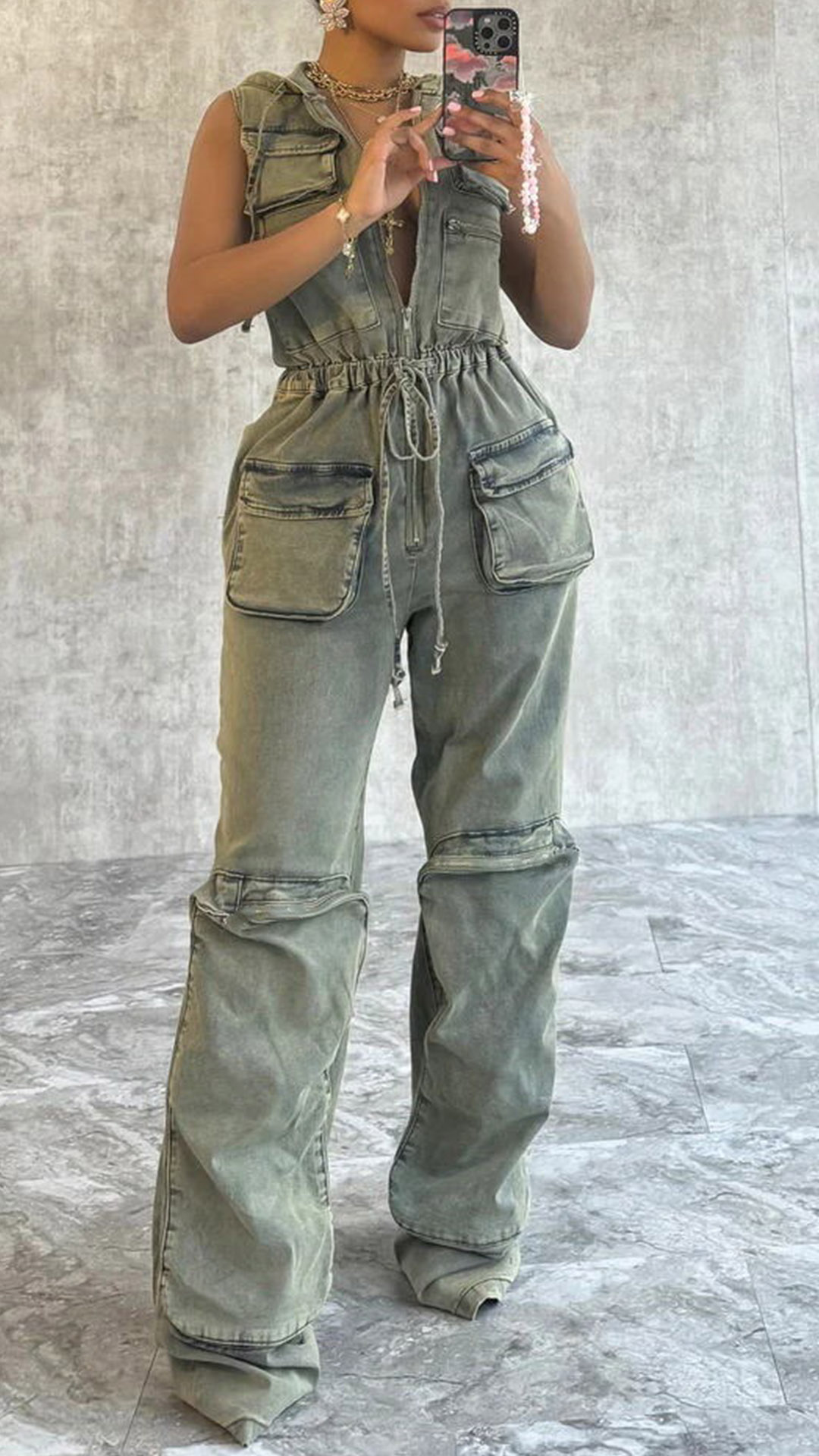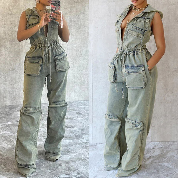 This street-style denim jumpsuit with patch pockets, a sleeveless silhouette, elastic drawstring waist, and a hooded design sounds like an incredibly cool, on-trend piece! It has a cool, off-duty model vibe.