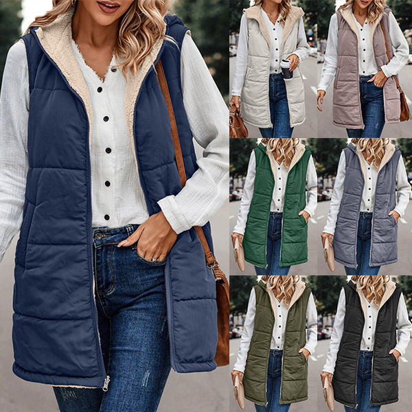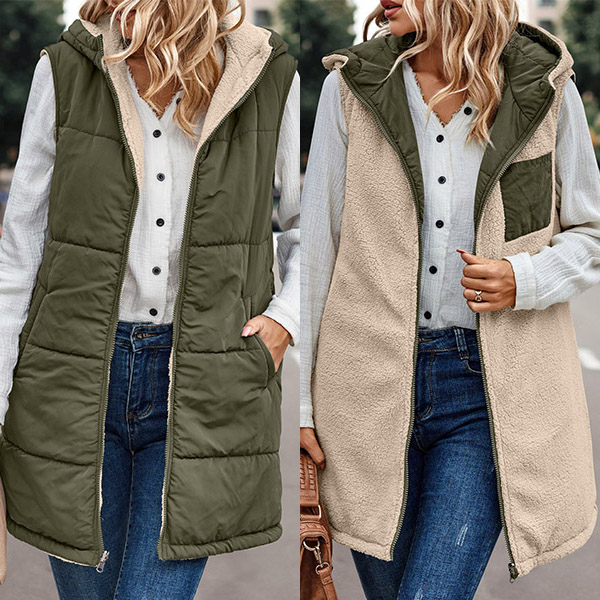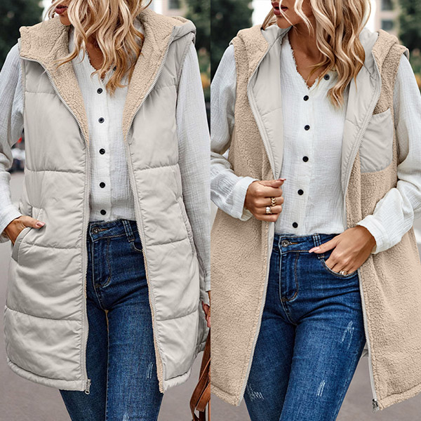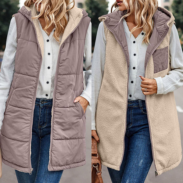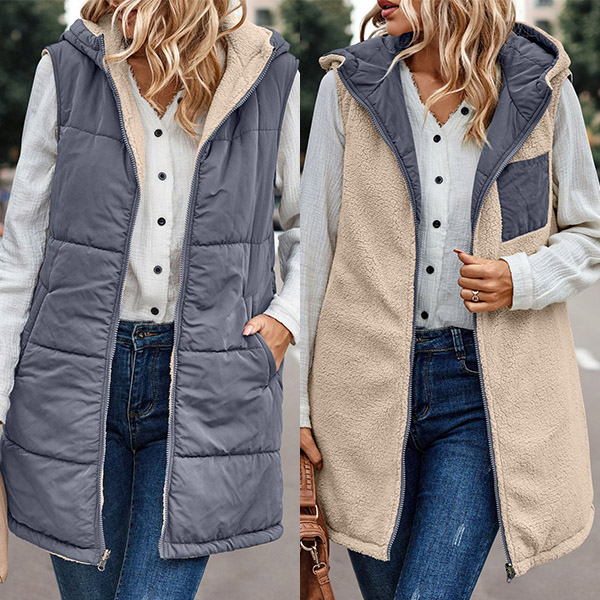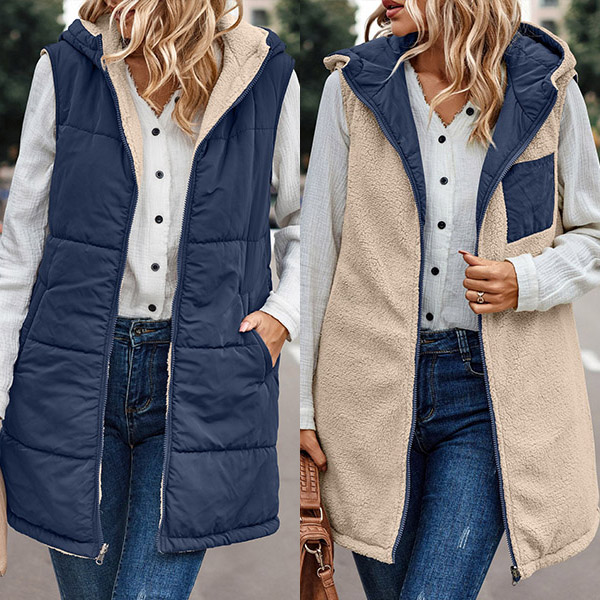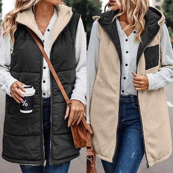 Street Fashion Plushed Lined Sleeveless Hooded Longline Reversible Coat