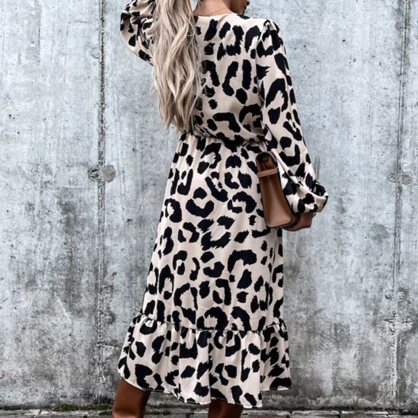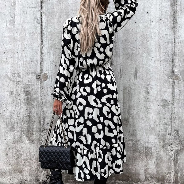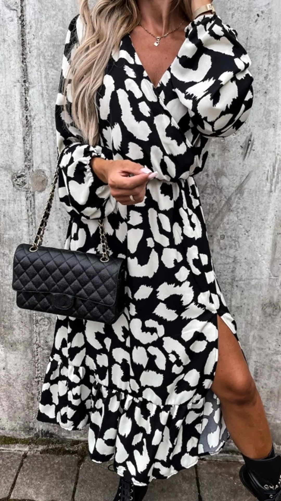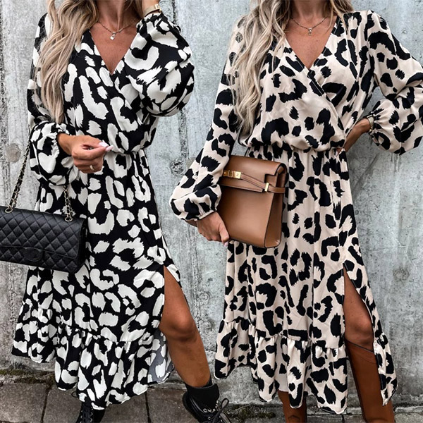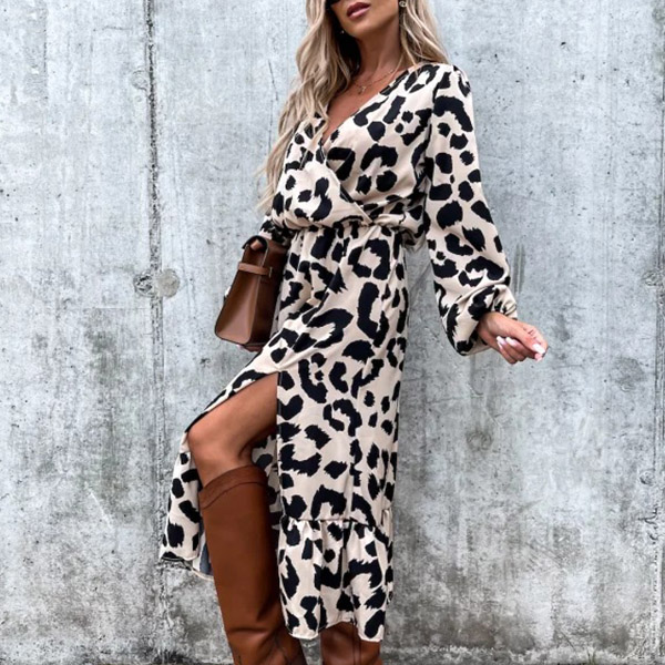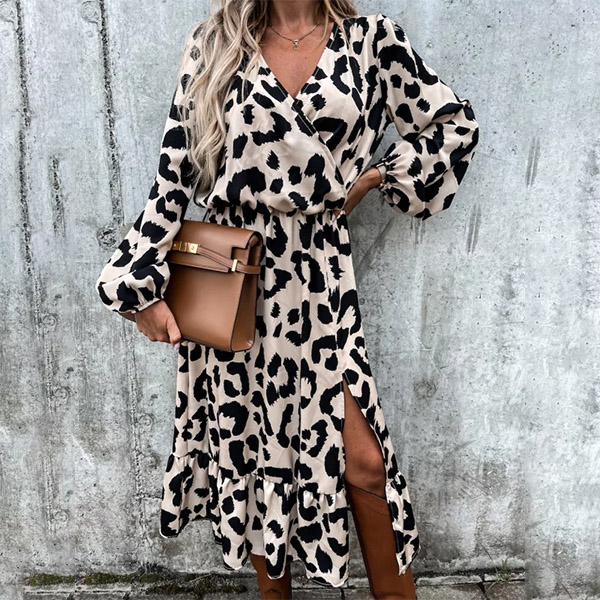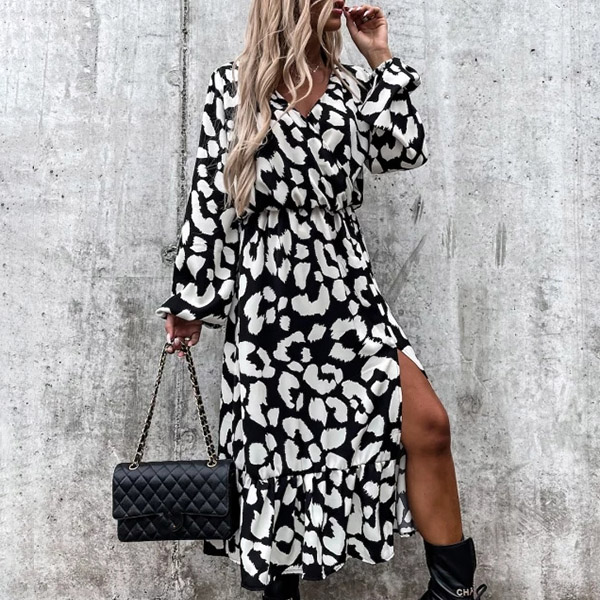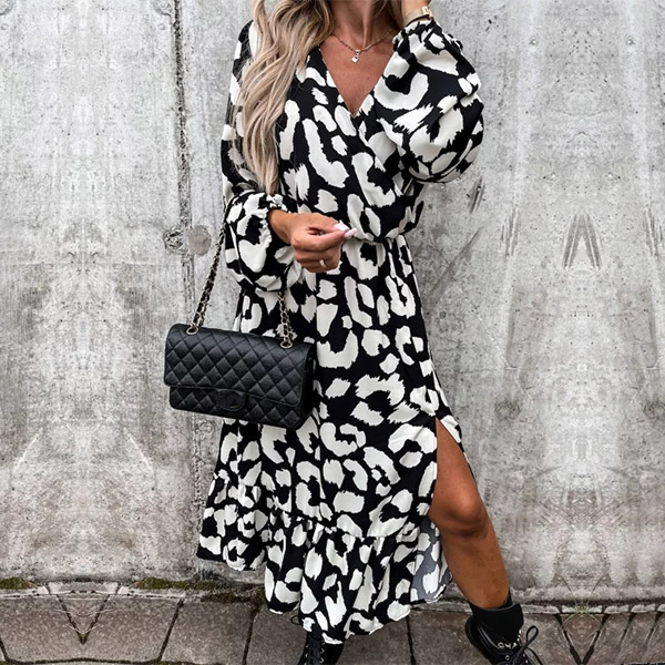 This dress features a printed design that exudes street fashion vibes. The V-neckline adds a touch of femininity and flattery. The slit detail adds a hint of allure and adds movement to the dress. This dress is perfect for various occasions and can be paired with heels or boots for a fashionable statement.