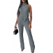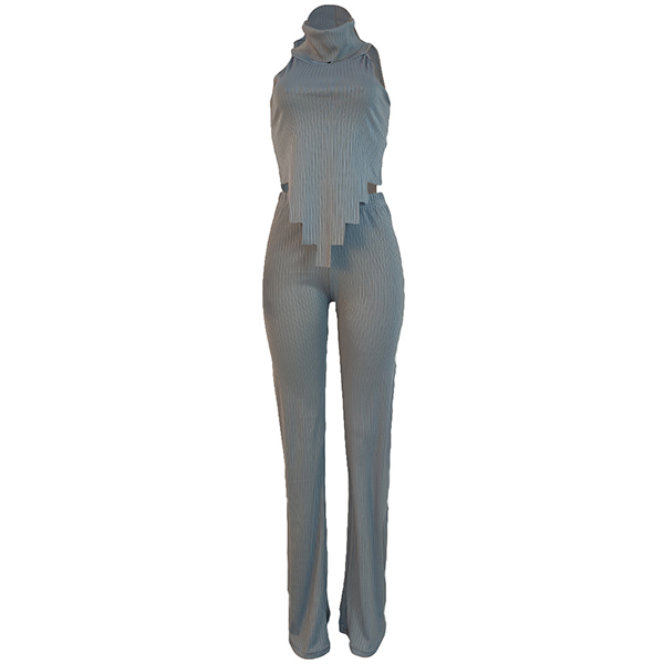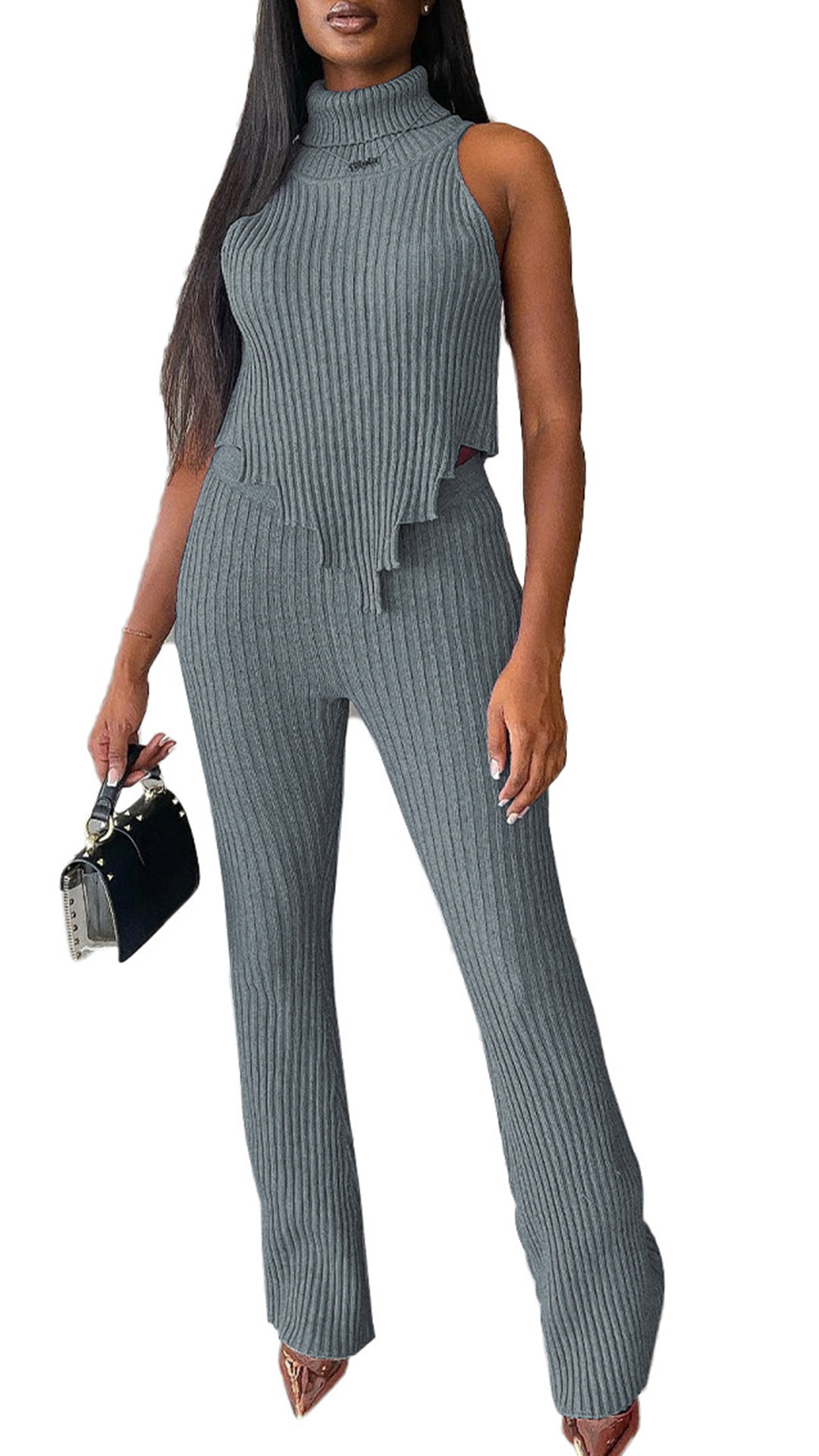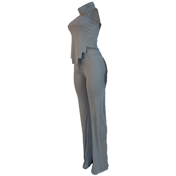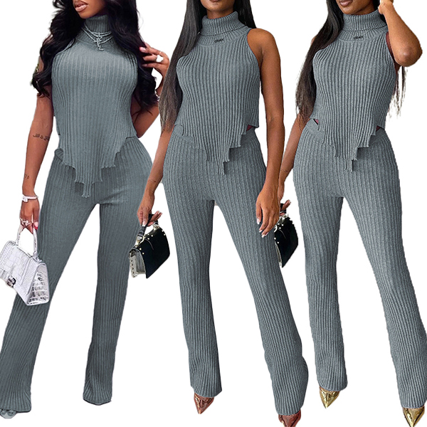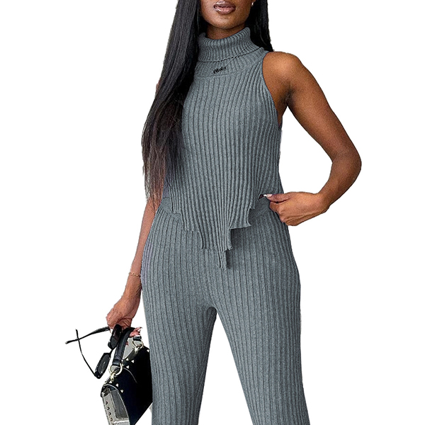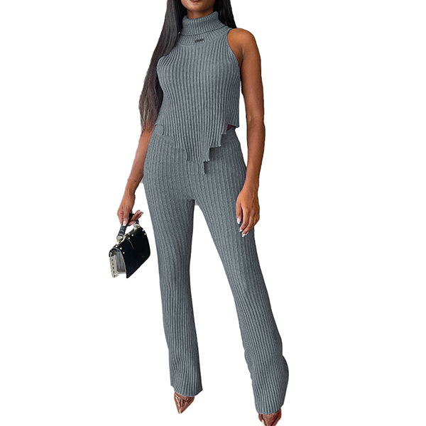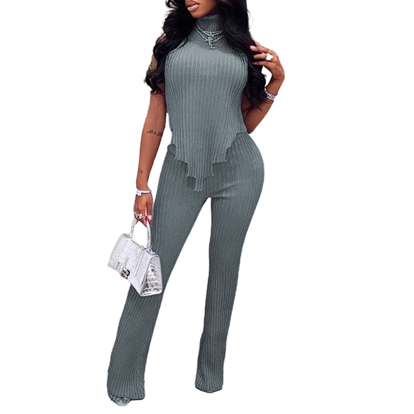 Street Fashion Ribbed Two-piece Set Consist of Turtleneck Sleeveless Irregular Hemline Shirt and Wide-leg Pants