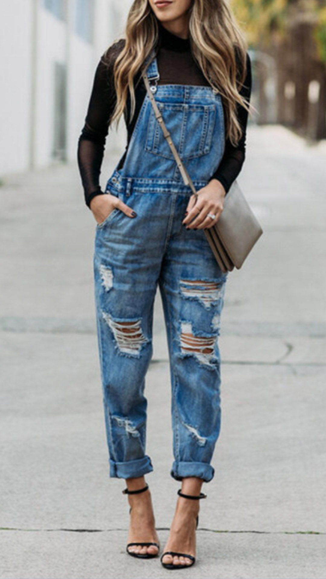This one-of-a-kind piece features ripped and distressed denim for a cool, edgy look.
