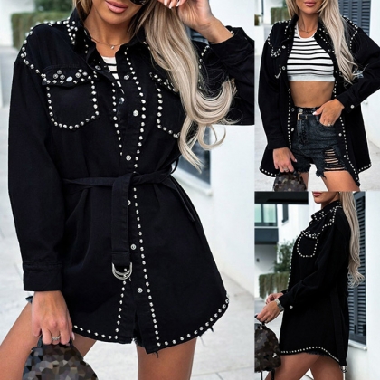 Street Fashion Rivet Long Sleeve Self-tie Denim Jacket