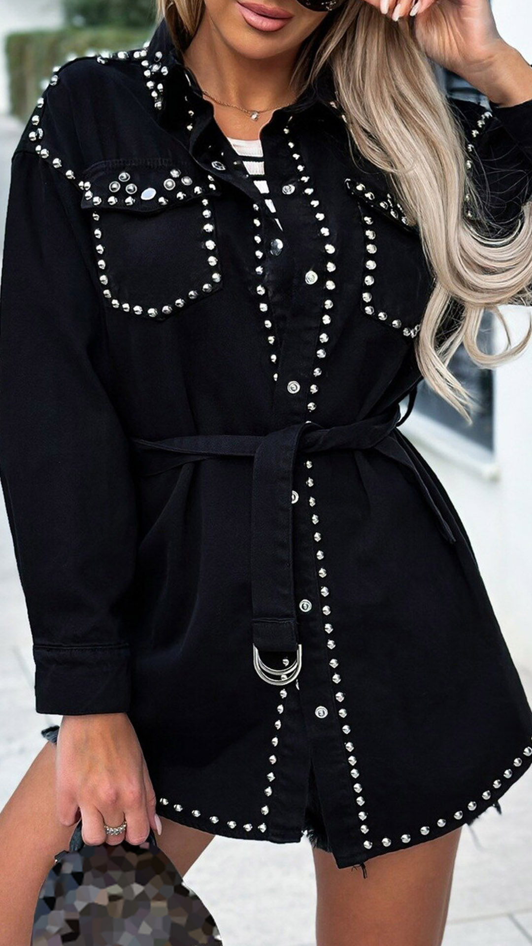 This denim jacket features long sleeves and a self-tie closure, allowing for customization and a cinched waist look. The rivet embellishments add a touch of attitude and create a statement-making effect. Made from denim fabric, this jacket is both stylish and durable.