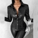 This edgy and stylish blouse features a stand collar adorned with rivet detailing for a bold and trendy look. Pair this blouse with jeans or a skirt for a chic and fashionable ensemble that will make you stand out from the crowd.
