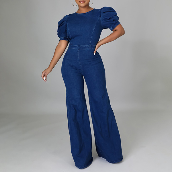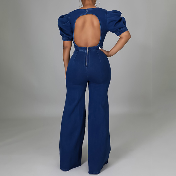 Street Fashion Round Neck Puff Short Sleeve Backless Wide-leg Denim Jumpsuit