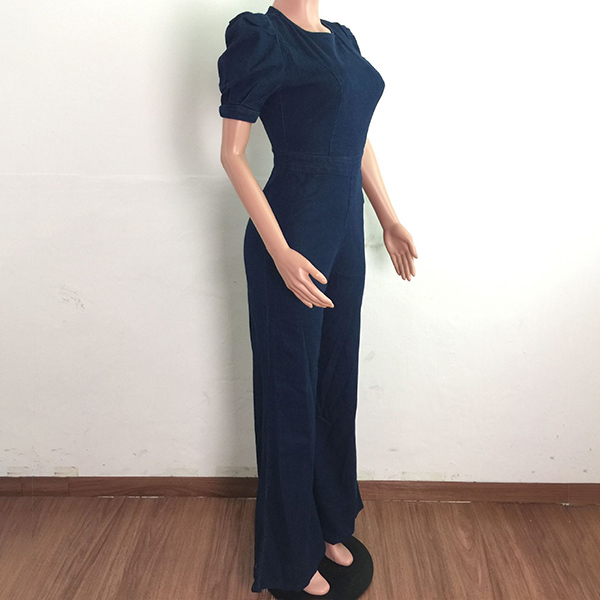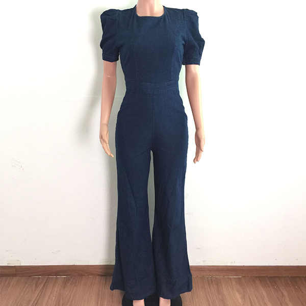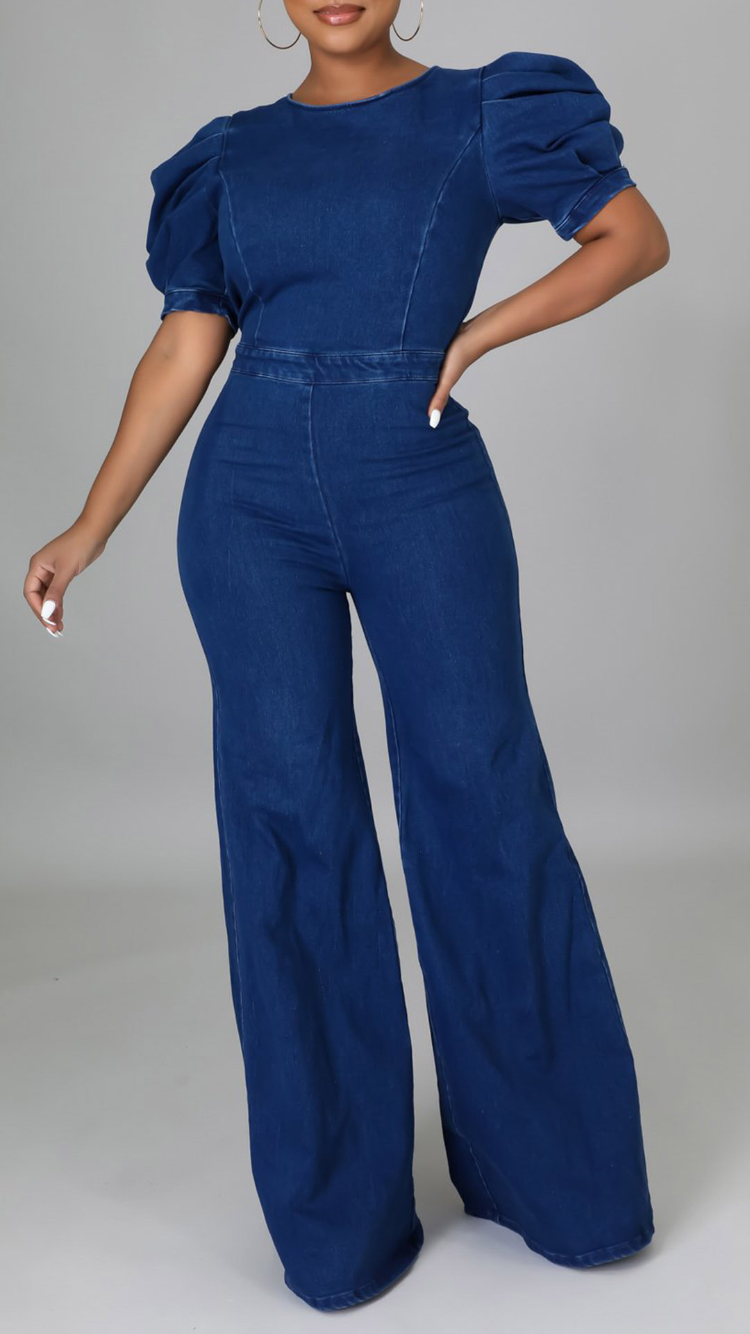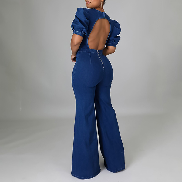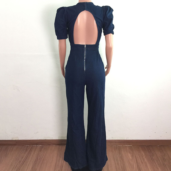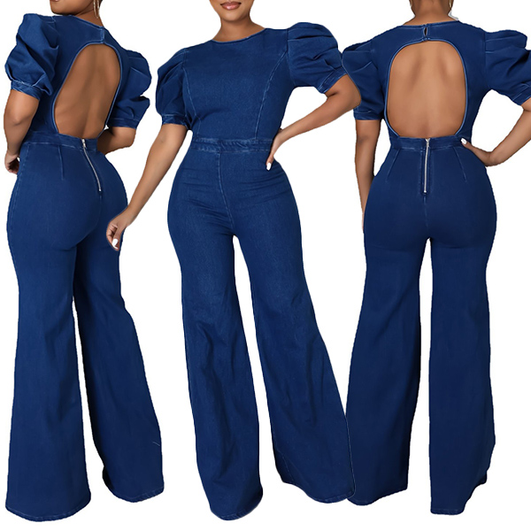 Wow, sexy and stylish jumpsuit for day-to-day wear! The round neckline and puff short sleeves give it a classic look, while the backless design and wide-leg silhouette add a modern touch. The denim fabric is comfortable and durable, making it perfect for any occasion. Whether you're going out for a night on the town or just running errands, this jumpsuit will keep you looking stylish and feeling confident.