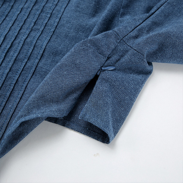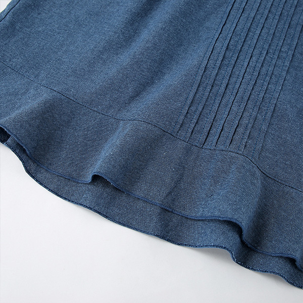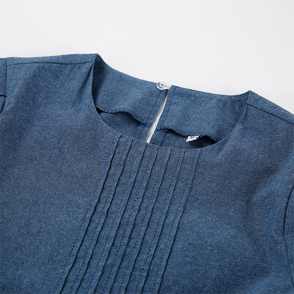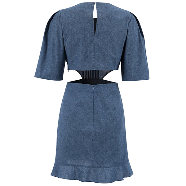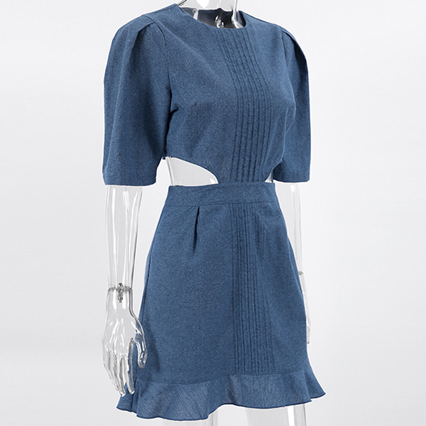 Street Fashion Round Neck Puff Short Sleeve Side Cutout Pleated Denim Dress