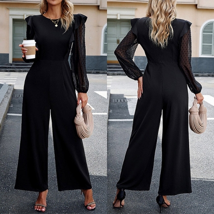 Street Fashion Ruffled Lace Spliced Long Sleeve Round Neck Wide-leg Jumpsuit