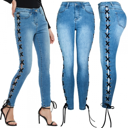 Bring a bold, street-inspired edge to your denim collection with these skinny jeans! This jeans feature a dramatic side lace-up detail that puts a unique spin on the classic skinny silhouette. Crafted from a stretchy, old-washed cotton-blend fabric, these high-rise jeans is perfect for daily wear.