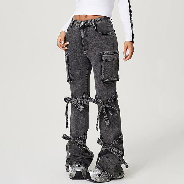 Make a fashion statement with this fashion denim Jeans. These trendy jeans feature side patch pockets and a self-tie bowknot on the leg for a stylish and unique look. The wide-leg silhouette adds a touch of retro flair, while the old-washed denim finish gives them a vintage-inspired vibe. Perfect for a day out in the city or a casual weekend look, these jeans are sure to elevate your style and make a statement. Hope you like it.