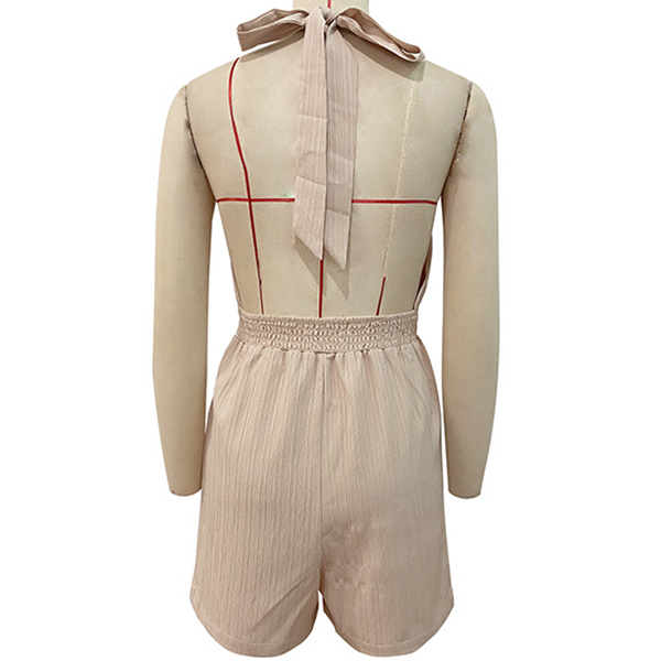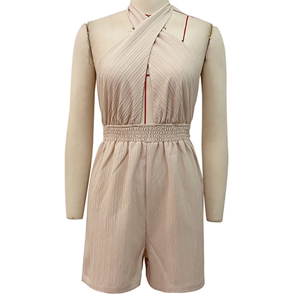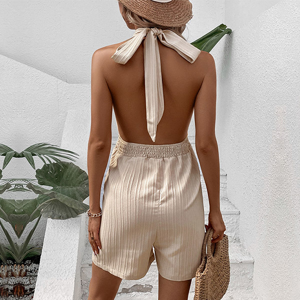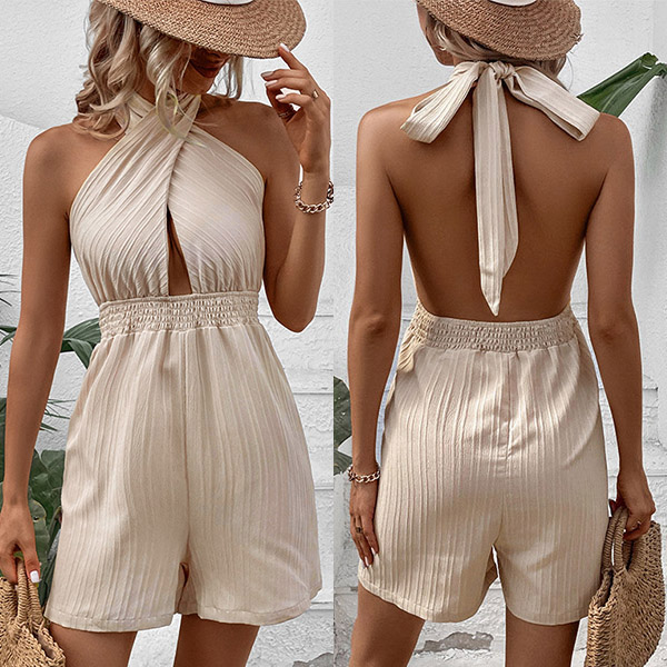 Street Fashion Solid Color Halter Neck Backless Smocked Waist Romper