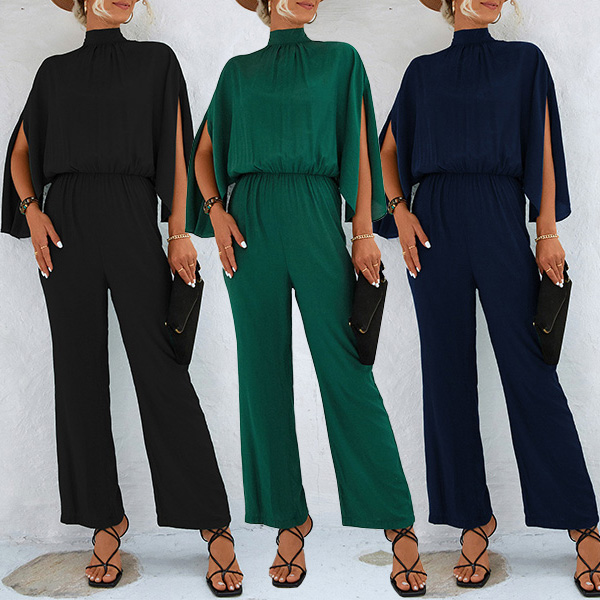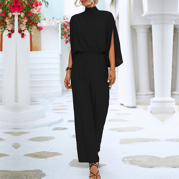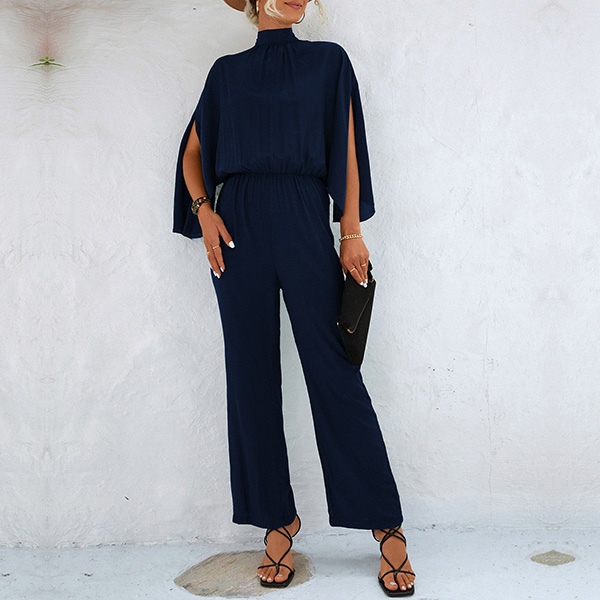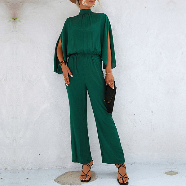 Street Fashion Solid Color Mock Neck Slit Elbow Sleeve Jumpsuit