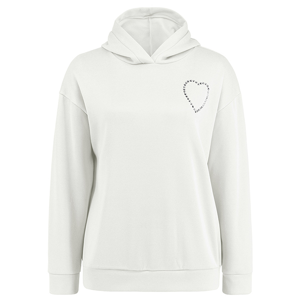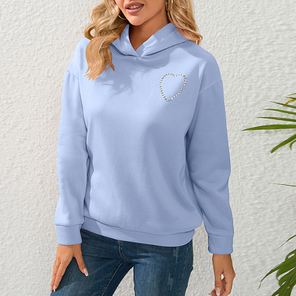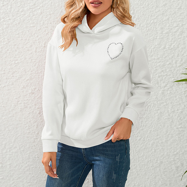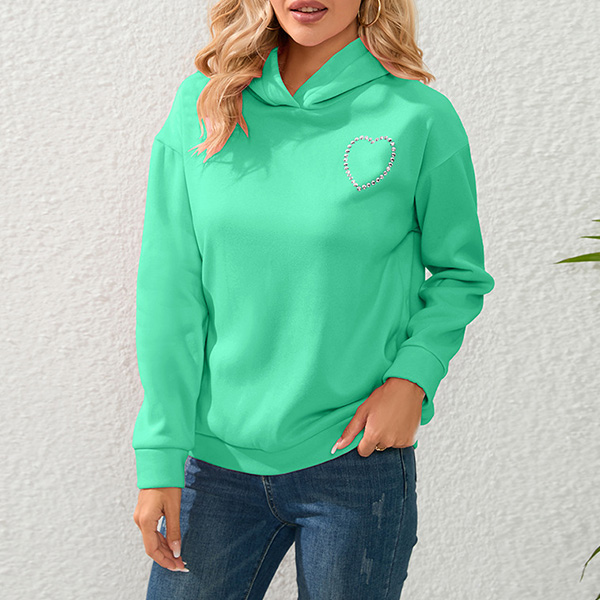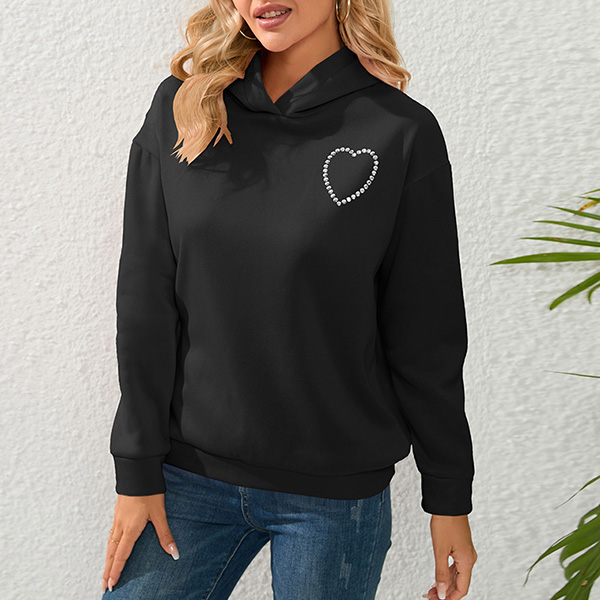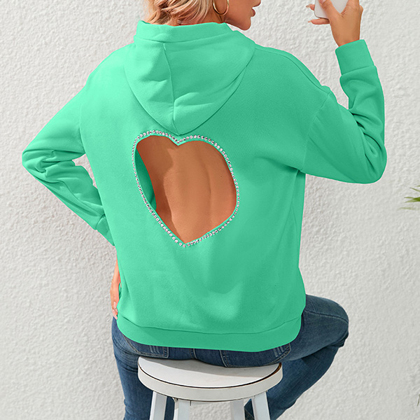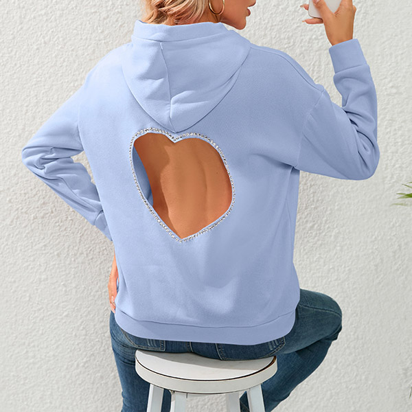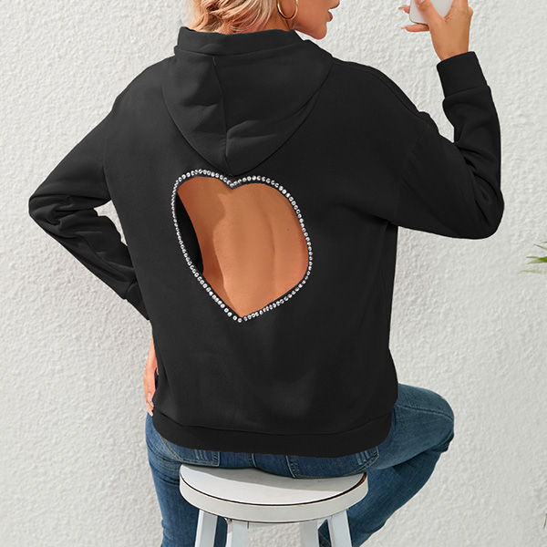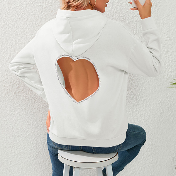 Street Fashion Solid Color Rhinestone Heart Cut Out Hooded Sweatshirt