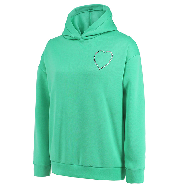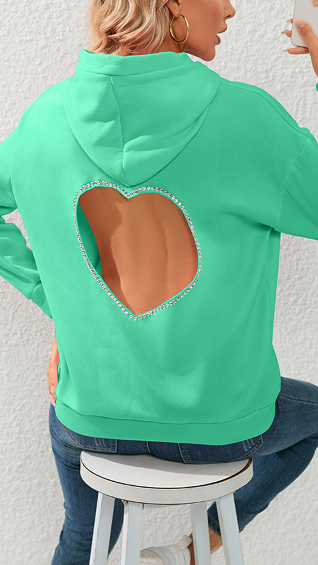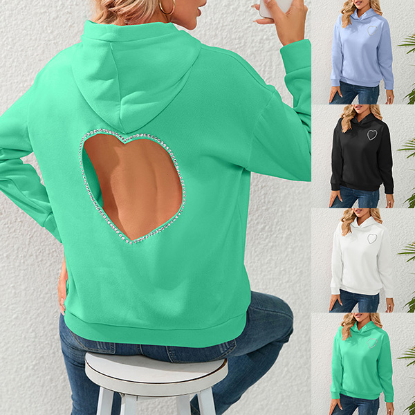 This sweatshirt features a solid color design for a sleek and modern look. The highlight of this piece is the rhinestone heart cut-out detail at the back, which adds a touch of sparkle and sophistication. Multi-color is avaible.