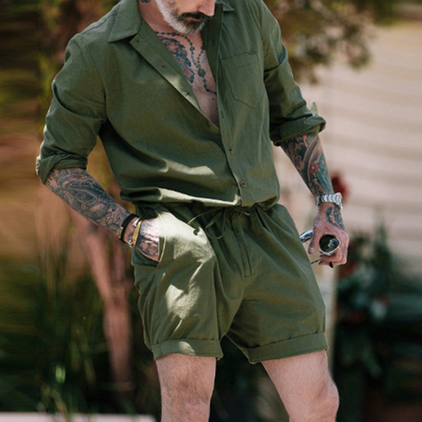 Street Fashion Solid Color Stand Collar Buttoned Drawstring Long Sleeve Romper for Men