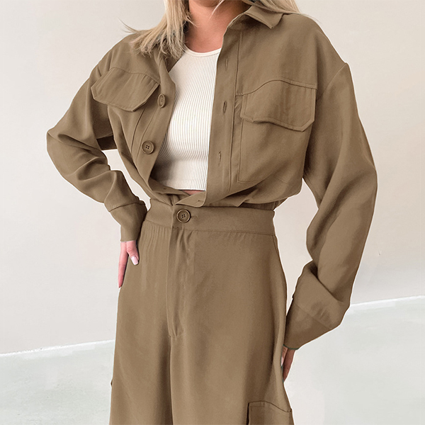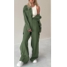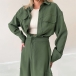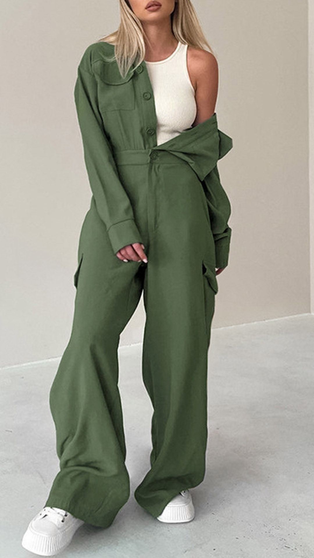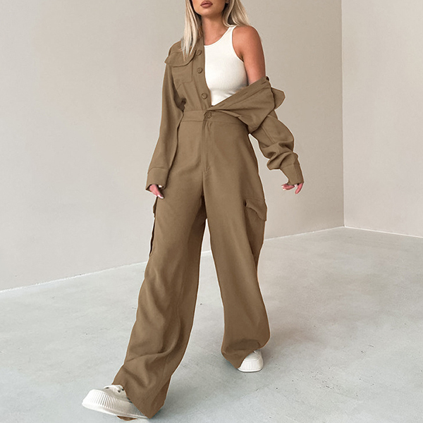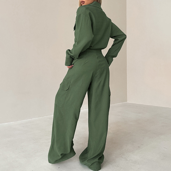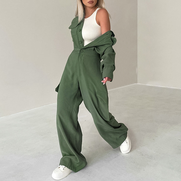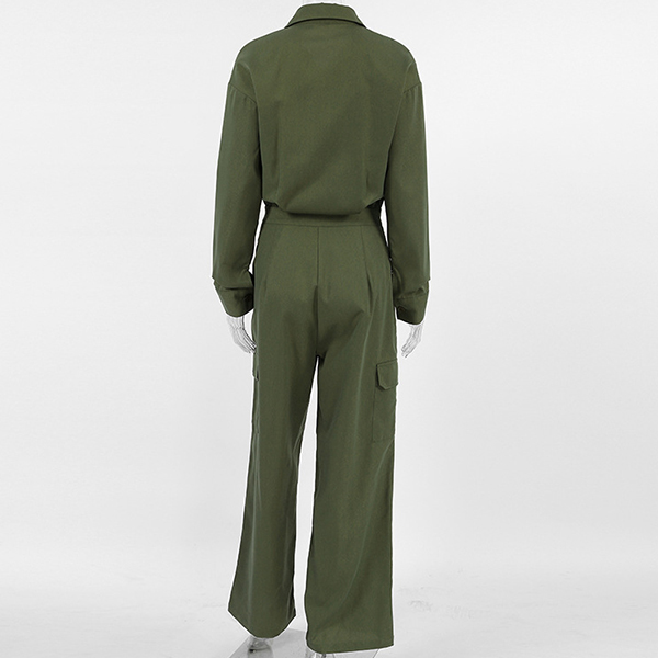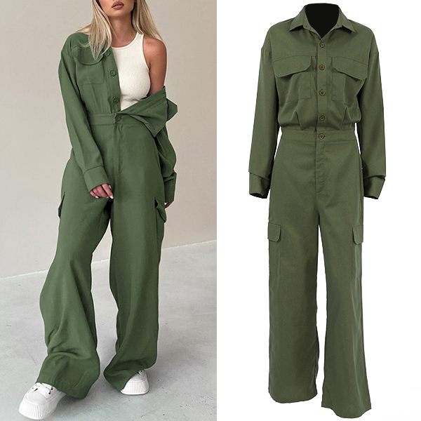 This is a trendy and edgy jumpsuit that combines modern design with a touch of urban flair. The solid color adds a minimalist and versatile touch to the jumpsuit, making it easy to style and accessorize. The stand collar design offers a unique and fashion-forward silhouette, while the straight-cut legs create a streamlined and elongating effect, adding a touch of sophistication to the overall look. Crafted from high-quality fabric, this jumpsuit is designed to be both stylish and comfortable.
