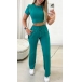 This set consists of a trendy crop top and drawstring pants, both in a solid color, for a sleek and fashion-forward look.