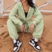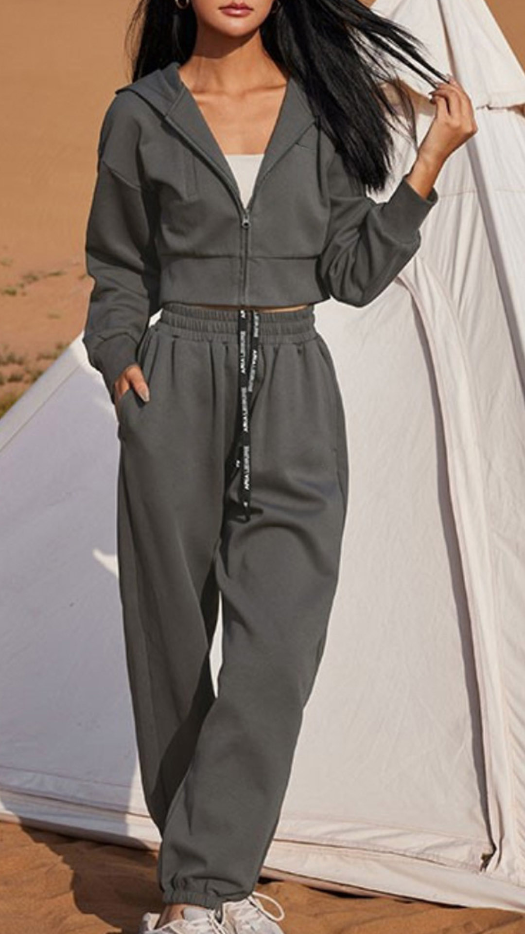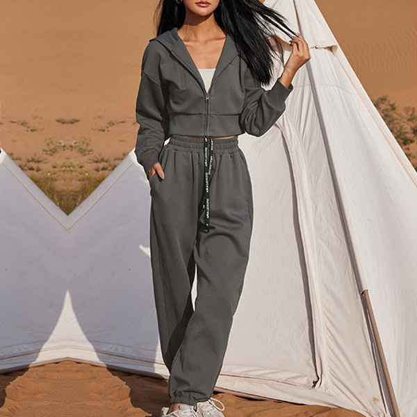 This set effortlessly combines fashion and comfort. The solid color design offers versatility, making it easy to mix and match with other pieces in your wardrobe. The drawstring details on both the sweatshirt and sweatpants provide a customized fit and add a stylish element. Crafted with a soft and comfortable fabric, this sport set is perfect for casual outings, workouts, or lounging at home.