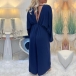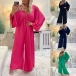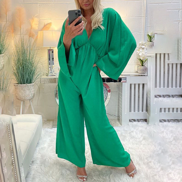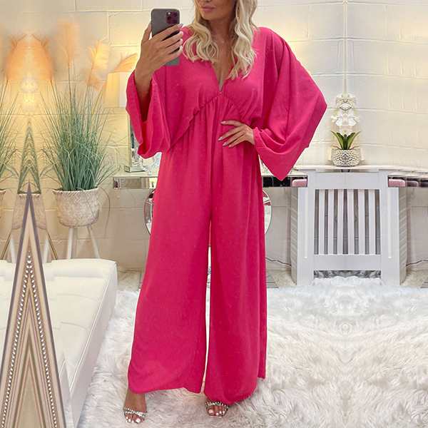 Street Fashion Solid Color V-neck Batwing Sleeve Wide-leg Loose Jumpsuit