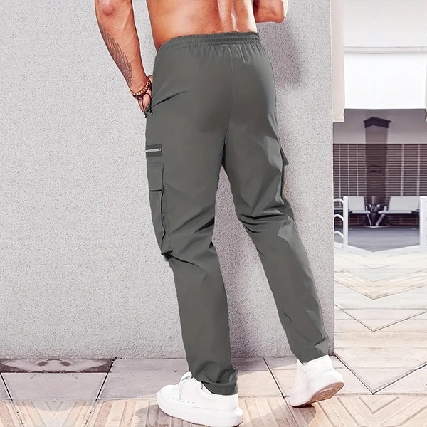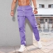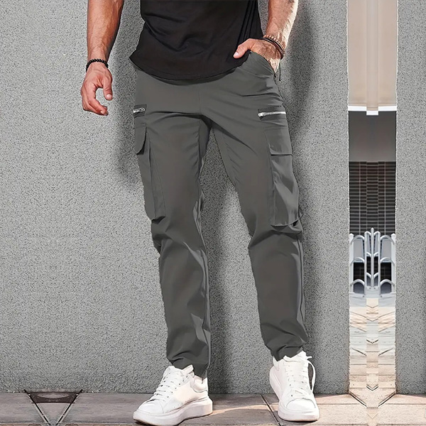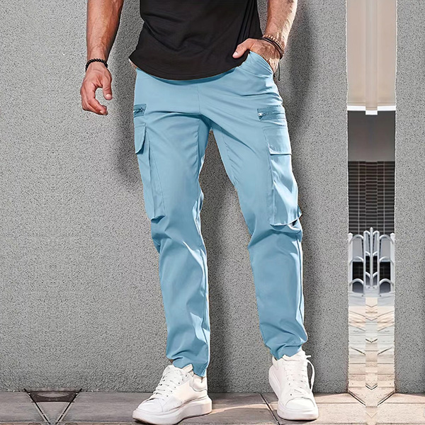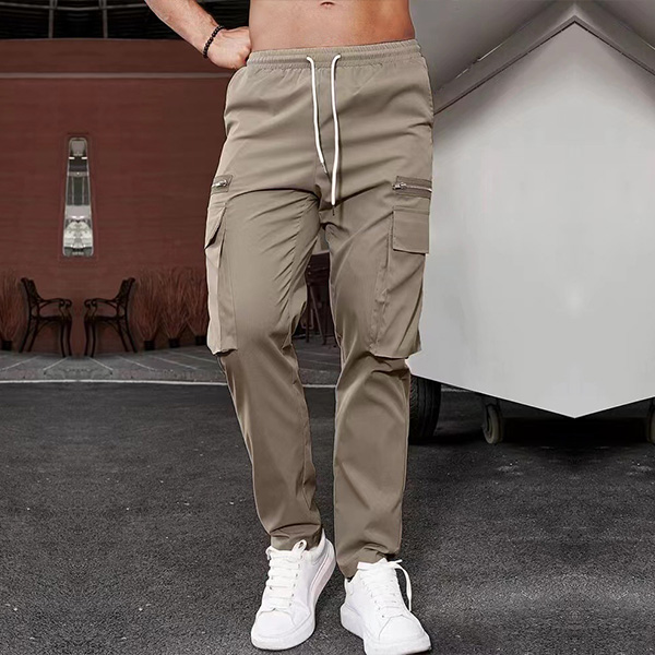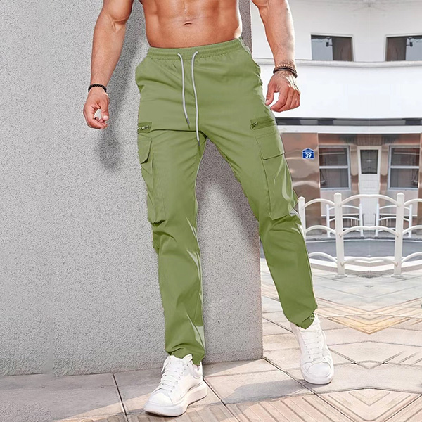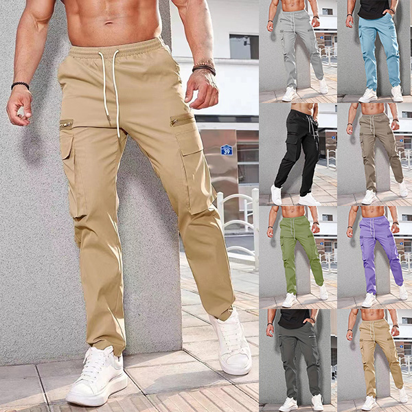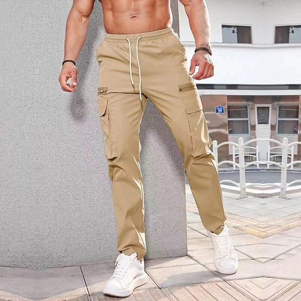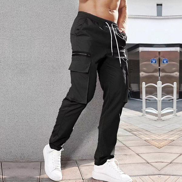 Street Fashion Solid Color Zipper Patch Pockets Drawstring Elastic Waist Cargo Pants for Men