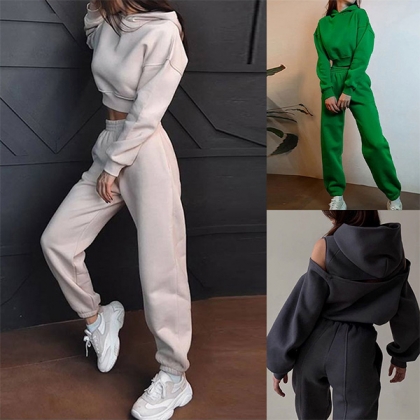 Street Fashion Sporty Two-piece Set Consist of Crop Hooded Sweatshirt and Sweatpants