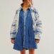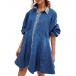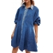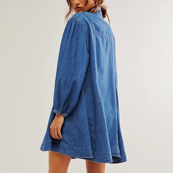 Street Fashion Stand Collar Lantern Long Sleeve Front Button Denim Shirt Dress