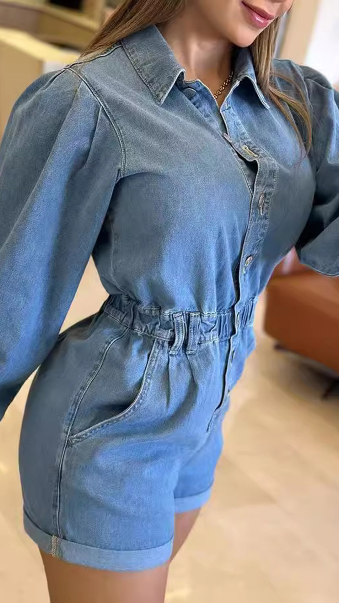 This denim romper is a chic and trendy piece that combines comfort with urban style. The stand collar adds a modern and edgy touch to the romper, while the long sleeves provide coverage and warmth. The elastic waist offers a flexible and flattering fit, cinching in at the waist for a defined silhouette. Pair it with sneakers and a crossbody bag for a casual and urban-inspired outfit!