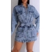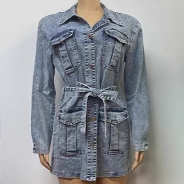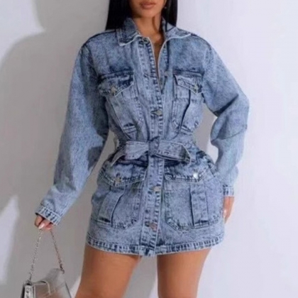Street Fashion Stand Collar Long Sleeve Patch Pockets Old-washed Denim Dress with Self-tie Belt
